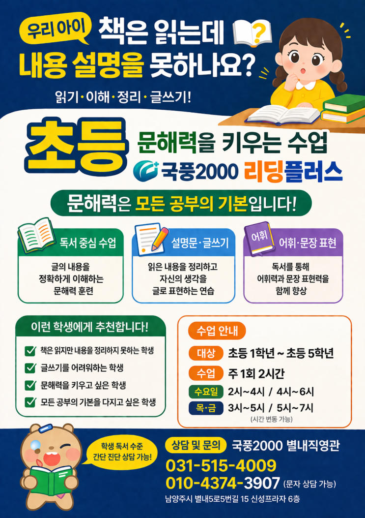 안녕하세요. 올바른 국어 교육을 지향하며 학생들의 문해력을 키워주는 학원 초등 · 중등 · 고등 국어 전문학원 국풍2000 별내직영관입니다. 이런 고민 해보신적 있으신가요? 초등 학부모님들과 상담을 하다 보면 가장 많이 듣는 이야기가 있습니다. “책은 곧잘 읽는데 내용 설명을 잘 못해요.” 책을 읽는 것과 내용을 이해하고 정리하는 능력은 다른 영역이기 때문입니다. 그래서 초등 시기에는 단순히 책을 많이 읽는 것보다 ✔ 읽은 내용을 이해하고 ✔ 핵심을 정리하고 ✔ 자신의 생각을 표현하는 훈련 이 과정이 매우 중요합니다. 이러한 능력을 우리는 **‘문해력’**이라고 합니다. 문해력은 모든 공부의 기본입니다 문해력은 국어 과목....... <img src="https://blogthumb.pstatic.net/MjAyNjA0MDVfMjU3/MDAxNzc1MzY3MTEzNjQw.ExTKTeyIjhUFA4A6JuMphCijv1zuV8ylCsWfoG69BuUg.G72knjHAJUWqrqxtAGRHYPWM8o4clT1ht83got1DWlog.PNG/%C3%D6%C1%BE1.png?type=s3" />