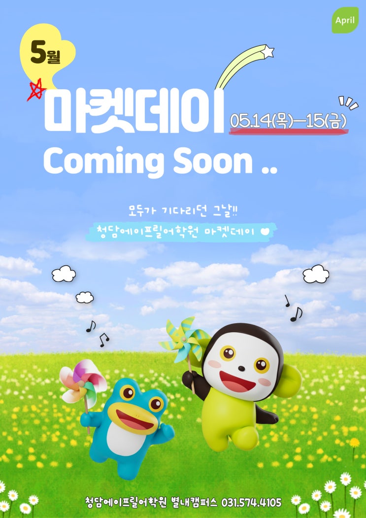 기다리고 기다리던 그 소식을 가져왔어요!!!!!!!! 소문난 그 잔치. 별내 청담에이프릴어학원 마켓데이 날짜가 확정되었어요!! 꺄아아악 에이프릴은 에이프릴대로 ❤️❤️ 청담은 청담대로 ❤️❤️ 우리 모두 각자의 분위기로 마켓데이를 즐 겨보아요 >_< 봄학기 신규라서.. 포인트가 얼마 없다고 걱정하지 마세요! 신규생에게 단 한번만 주어지는 ⭐⭐⭐ Welcome Point 가 있다구요!!! ⭐⭐⭐ 그러니 모두함께 즐길 준비만 해주세요 청담April어학원 별내캠퍼스 031.574.4105 <img src="https://blogthumb.pstatic.net/MjAyNjA0MDdfMTU3/MDAxNzc1NTU1MzgxODg0.w2cqhvGbGFLYDpuy9asXo2m1svHJ4GLcSikzLLwIvMQg.iqz56Tq_z5aM0LVRdp4HZJltDOcoMLx85-eL5jEfrAYg.JPEG/%B8%B6%C4%CF%B5%A5%C0%CC_%C6%F7%BD%BA%C5%CD1.jpg?type=s3" />
