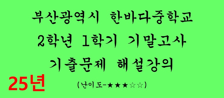 2026학년도 1학기 기말고사 시험대비 중학교 2학년 1학기 기말고사 기출문제 해설강의입니다. 부산광역시에 있는 한바다중학교 2025학년도 기출문제입니다. 시험범위는 유리수와 순환소수, 식의 계산 입니다. 난이도는 중으로 평이합니다. 일차함수에 관한 문제입니다. 두 점이 주어지면 기울기를 구할 수 있습니다. 기울기를 알면 한 점을 이용해서 직선의 방정식 일차함수 식을 구할 수 있습니다. 연립방정식의 해를 대입해서 식을 최대한 간단히 정리한 뒤 연립해서 미지수 a , b 를 찾습니다. 더 자세한 설명은 다음 동영상 해설강의를 참고하세요. ^^ 평내수학과외합니다. 초등 중등 고등 수학과외합니다. 문의전화주세요. 평내대주수학과외....... <img src="https://blogthumb.pstatic.net/MjAyNjA0MDdfNzMg/MDAxNzc1NTI2NDYwNzkx.Bn1ReulmvsZLgBbG1Vu6xrusczlF6jNDNd5PvOeq6O0g.pWYWTQtiRLDby3Bt5m1yUwtEF-v1MijmQ-qTBX7yDZQg.JPEG/1370.jpg?type=s3" />