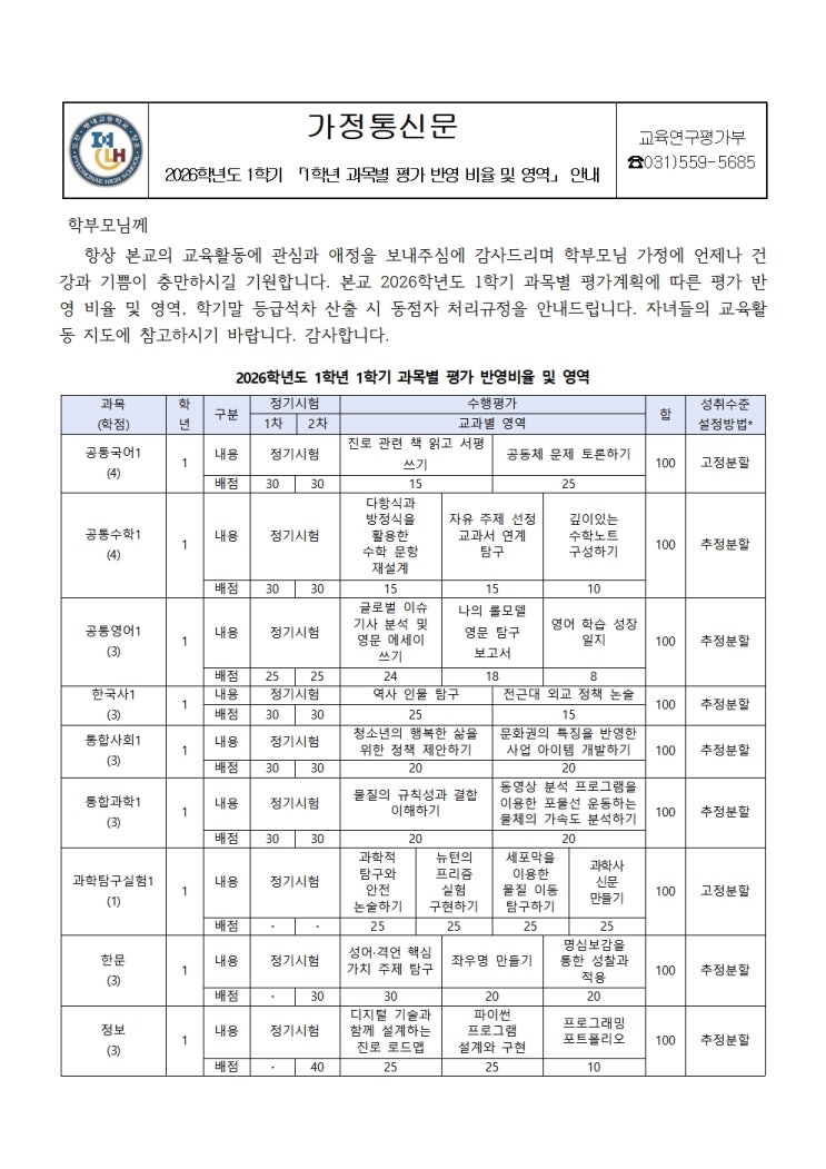 2026 평내고1 1학기 평가비율[호평동][포스텍 수학학원]
