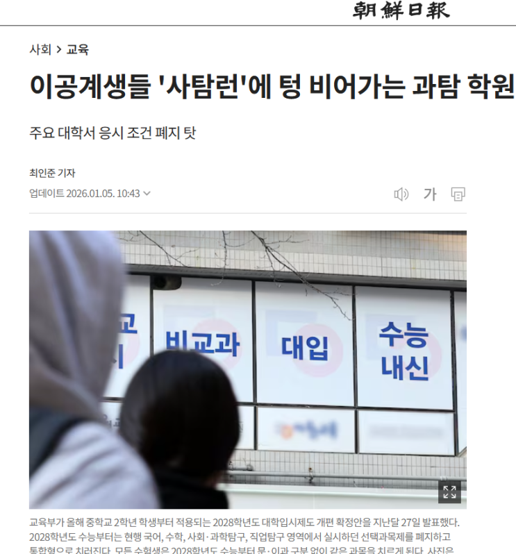 최근 교육부 발표와 함께 여러 언론에서 이공계 학생들의 ‘사탐런’ 현상을 다루고 있습니다. 자연계 학생들이 수능에서 과학탐구 대신 사회탐구를 선택하는 흐름이 일시적 현상이 아니라 구조적인 변화로 보인다는 분석입니다. 이 글은 특정 학원을 홍보하거나, 방향을 단정하기 위한 글이 아니라 현재 고등학교 학부모님들께서 헷갈려하시는 입시 흐름을 정리해 드리기 위한 자료 정리용 포스팅입니다. 기사에서 말하는 핵심 변화 정리 언론 보도를 종합하면, 최근 ‘사탐런’이 가속화된 배경은 크게 세 가지입니다. 1. 대학들의 탐구 과목 지정 폐지 과거에는 자연계열 지원 시 과학탐구 응시가 사실상 필수였습니다. 하지만 최근 몇 년 사....... <img src="https://blogthumb.pstatic.net/MjAyNjAxMDdfMTMz/MDAxNzY3Nzg3NDY5NjQx.K6U1JT2Iina2DHHDqnt6SP7tNg4erZ2Psl-40M6oB4Ug.yCOND06pyDA-YVNkSDqmH_mFX4xy-1qY1b2-cgdZ6oMg.PNG/%BD%BA%C5%A9%B8%B0%BC%A6_2026-01-07_210326.png?type=s3" />