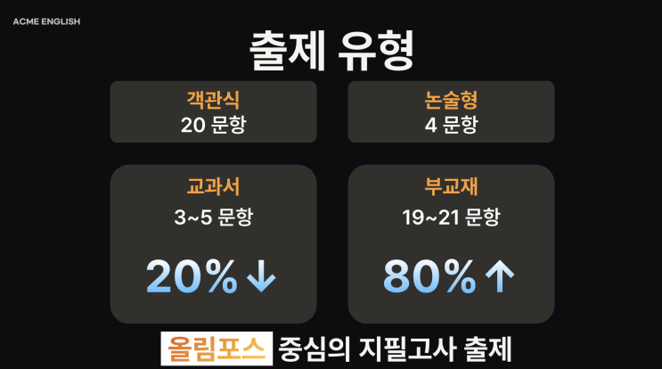 안녕하세요. 함현고 전문 아크메 셀리움 영어학원입니다. 어느새 방학인 한달도 채 남지 않은 시점이 되었습니다. 오늘은 함현고 진학을 앞둔 학생들을 위해, 함현고의 영어 시험이 어디서, 어떻게 출제되는 지에 대한 범위와 유형을 설명드리려고 합니다. ✅ 시험 범위 함현고의 영어 시험은 교과서와 올림포스 전국연합학력평가 기출문제집에서 출제가 됩니다. '올림포스 전국연합평가 기출문제집' 이란? 올림포스 전국연합학력평가 기출문제집(소위 올림포스)은 과거 고1 모의고사에서 출제되었던 기출 문항들이 유형별로 수록된 문제집입니다. 함현고의 시험은 이러한 올림포스에서 각 단원(유형)당 1~2지문으로, 총 20~22개 지문....... <img src="https://blogthumb.pstatic.net/MjAyNjAyMDZfMTkx/MDAxNzcwMzc2MTU0MjI1.D2JUabjsEXeqi7vqRv3dqjQATpCc-mhZYvaiJexOH_0g.e45jsHTk-xjt8rYclHFw6f9_Zt6hkFZoO0vxsr7fvm0g.PNG/image.png?type=s3" />