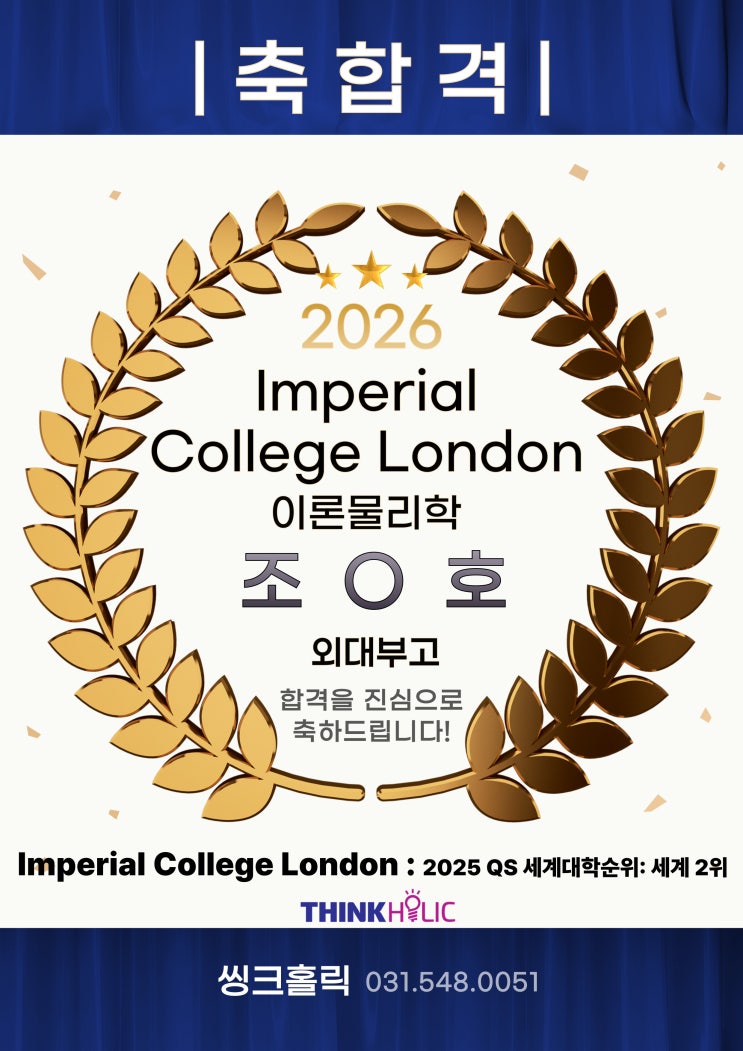 2026 임페리얼 컬리지 런던 : 조 ○ 호 (외대부고) [이론물리학] 합격을 진심으로 축하합니다! 우리 씽크홀릭의 자랑! 모두 잘하지만 특히 물리를 더 좋아하고 물리를 더 잘하는 "O호"의 Imperial College London의 합격 소식을 전해드리게 되어 너무 영광입니다!! Imperial College London 은 영국을 넘어 세계 최상위 STEM 특화 대학으로 평가받는 연구 중심 명문 대학으로, 2025 QS 세계대학순위 랭킹 2위의 학교랍니다!!! 유럽에서 높은 명성을 지닌 학교로 본래 자연과학, 응용과학, 사회과학 등을 포함한 전반적인 과학 분야의 엘리트 양성을 위해 세워진 학교답게, 907년에 개교한 이래로 14명의 노벨상 수상자, 3명의 필즈상 수....... <img src="https://blogthumb.pstatic.net/MjAyNjA0MDFfMjg4/MDAxNzc1MDIzMzY5MjU3._zwWZPH0qNUPC3CP2A6WN4JqoaEPGYiAvIVn5zDEx-Eg.Um2JN2-1yKVLppZb_m1BSNntTUr7VcHgW3FM-qlYUFUg.JPEG/%C1%B6%C0%E7%C8%A3.jpg?type=s3" />