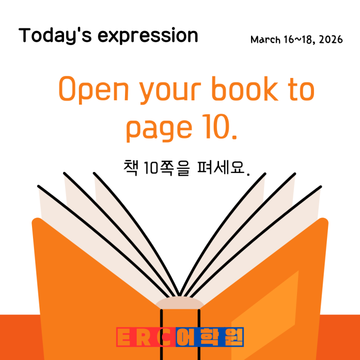 March 16~18, 2026 Today's Expressions 이번 달 주제: 학교 생활 (School Life) Open your book to page 10. (책 10쪽을 펴세요.) Proverb 이번 달 주제: 학교와 배움 (School & Learning) A little knowledge is dangerous. (선무당이 사람 잡는다.) Nothing in the world can take the place of persistence. Keep up studying. ERC어학원 경기도 용인시 수지구 만현로 110 원희캐슬 6층 내 꿈을 찾아가는 즐거운 공부~ 꼼꼼한 관리로 소문난 ERC어학원~ Phonics부터 중등을 넘어 수능까지 쭈~욱! #Today's #Expression #Proverb #상현동영어학원 #상현동어학원 #수지구영어 #상현초 #서원초 # 솔개초 #이현초 #심곡초 #서원중....... <img src="https://blogthumb.pstatic.net/MjAyNjAyMjNfMjE0/MDAxNzcxODQ0MDA4NTY4.Bv2RGkyeuUwbCMu-UjrvFzdUz_aCuZAoRKeXvH6uIHEg.FMLSx7VcZZElu5ff-IQUeU8Tt0lrGtYs638lZ8ZCqg4g.PNG/0_TE_20260316.png?type=s3" />