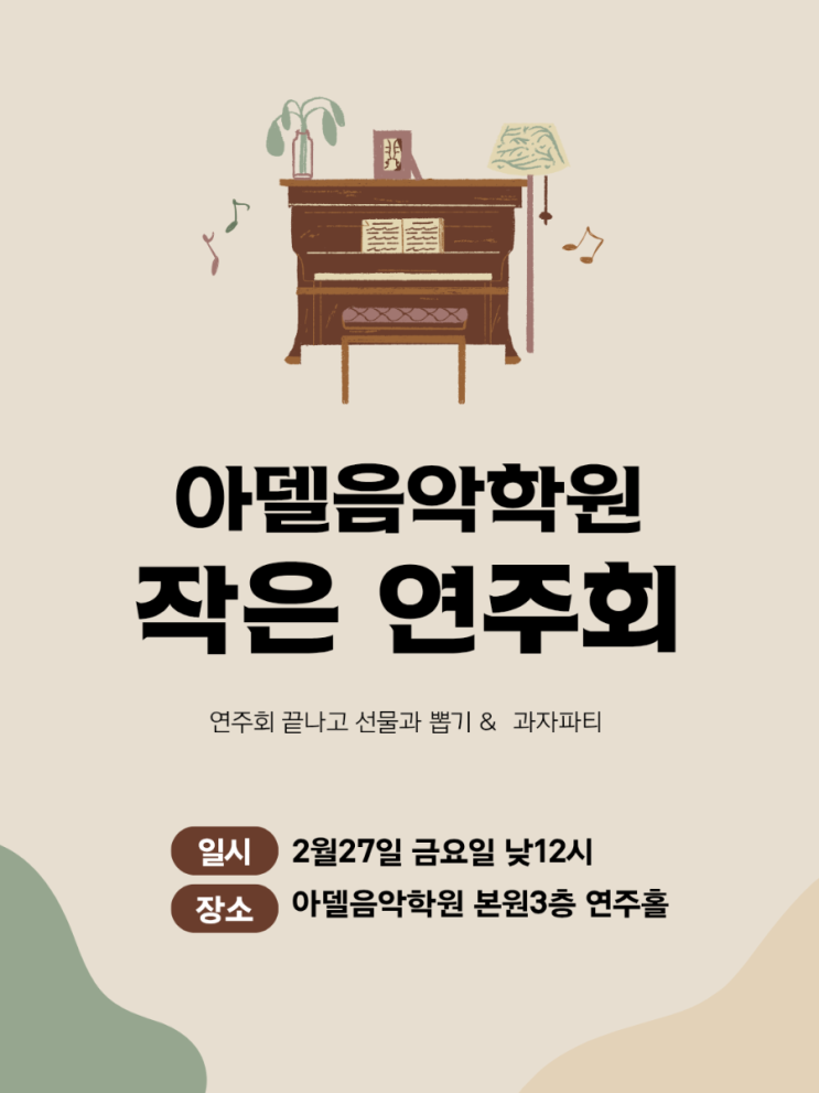 아델음악학원에서 작은 연주회를 진행했습니다. 아이들이 그동안 연습한 곡을 친구들 앞에서 연주하며 무대 경험도 쌓고 서로의 연주를 응원하는 시간이었습니다. 연주가 끝난 후에는 선물 뽑기와 과자 파티도 함께하며 즐겁게 마무리했습니다. 긴장도 했지만 끝까지 연주해 준 우리 아이들 모두 정말 잘했습니다. 앞으로도 즐겁게 음악을 배우며 성장하는 시간이 되길 바랍니다. 010 9799 1189 <img src="https://blogthumb.pstatic.net/MjAyNjAzMTVfOTUg/MDAxNzczNTQ0Mjk5NzYw.9Ej_fW9VwMiBYO6S84ZlOZZ0Dtr_GojuOFdtK3eexVcg.tEIxfX-XqWa8zhL5LysRDcUreAOTf760Htqi1Dv85Mcg.PNG/900%A3%DF1771932547752.png?type=s3" />