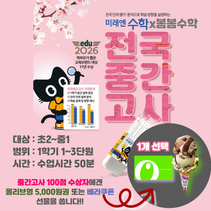 성복동 봄봄수학학원 2026년 1학기 전국중간고사 안내 4월 20일~22일 진행 안녕하세요. 성복동 봄봄수학학원입니다. 오늘은 4월에 진행되는 2026년 1학기 범위 전국중간고사 안내를 드리려고 합니다. 이번 시험은 단순히 점수를 확인하는 시험이 아니라, 아이가 현재 학년의 1학기 내용을 얼마나 정확히 이해하고 있는지, 또 어떤 부분을 더 보완해야 하는지를 객관적으로 점검할 수 있는 중요한 기회입니다. 봄봄수학학원은 평소에도 아이들의 실력을 꼼꼼히 지도하고 있지만, 이런 전국단위평가를 통해 현재 위치를 확인하고 다음 학습 방향까지 설계하는 과정을 매우 중요하게 생각합니다. 봄봄수학학원이 전국단위평가에 강한 이유 저희 학원....... <img src="https://blogthumb.pstatic.net/MjAyNjAzMTdfMTY2/MDAxNzczNzUzMzk4NjAy.0kYStV62HwUtrCHeRiSUDVSZIixvvhCW2DNKZfS5uf4g._DUNuI3mR3whgdBNjmvsmZbBisN93kK2QBlrjV_-tV8g.PNG/KakaoTalk_20260317_155248009.png?type=s3" />