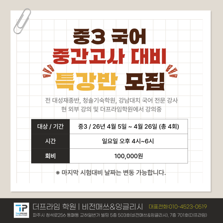 안녕하세요! 교하 지역에서 학생들과 꿈을 함께하는 더프라임 학원 / 비전매쓰&잉글리시입니다. 중간고사 준비를 시작하는 시기가 다가왔습니다. 1학기 중간고사를 앞두고 효율적인 성적 관리를 위해 대성, 종로학원 등에서 국어 강사를 역임한 14년 경력의 국어 전문 강사와 함께하는 중3 국어 중간고사 대비 특강반을 개설했습니다. 많은 관심 부탁드립니다. 대상: 중학교 3학년 기간: 2026년 4월 5일 ~ 4월 26일 (매주 일요일, 총 4회) 시간: 오후 4시~6시 회비: 100,000원 전화 문의: 010-4523-0519 * 시험일정에 따라 마지막 시험 대비 날짜는 변동 가능합니다.* ▼ 신청방법 ▼ 초등부 영어, 수학 신규원생 모집합니다. 초등부는 오후....... <img src="https://blogthumb.pstatic.net/MjAyNjA0MDJfMzgg/MDAxNzc1MTA2NTYxNzYx.Flbn-wHOdVmSOz84Ag1VxpVUgBq14UwI-Nj4JkPKRwcg.V5rj-JedptWHAwPgOGUBhPZ7olMbEzd6krb17fOfEHgg.PNG/%B1%B9%BE%EE_%C6%AF%B0%AD%B9%DD%B8%F0%C1%FD.png?type=s3" />