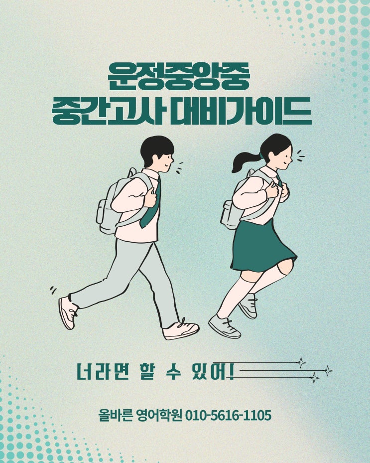 안녕하세요! 올바른 영어학원입니다. 벚꽃이 피어나는 아름다운 4월, 우리 아이들의 첫 단추를 꿰는 지필고사와 수행평가 시즌이 다가오고 있습니다. 특히 운정중앙중학교는 학생들의 창의적 사고를 요하는 논술형 평가 비중이 높아 전략적인 준비가 필수적인데요! 학부모님들의 걱정을 덜어드리고자, 제가 2026학년도 1학기 운정중앙중 1, 2, 3학년 영어 평가 계획을 정리해 드립니다. ✨ [운정중앙중 영어] 2026학년도 1학기 학년별 평가 계획 분석! 운정중앙중 영어 성적의 핵심은 지필고사의 서술형(논술형) 득점과 수행평가의 완성도에 있습니다. 각 학년별로 어떤 점에 집중해야 할지 표로 먼저 확인해 볼까요? 운....... <img src="https://blogthumb.pstatic.net/MjAyNjA0MDZfOTkg/MDAxNzc1NDYxNjU2ODIy.CpWFj9w9emZVu1i7o2-Y3Wp7KOg44o0g1M3ZPFmXzf8g.qrp27ieE7djxuBDNNGqKDX5ErJ0DcD2Fl1aE7gl-7uEg.JPEG/%BF%EE%C1%A4%C1%DF%BE%D3%C1%DF_%B3%BB%BD%C5%B4%EB%BA%F1_%C8%AB%BA%B8%B1%DB.jpg?type=s3" />