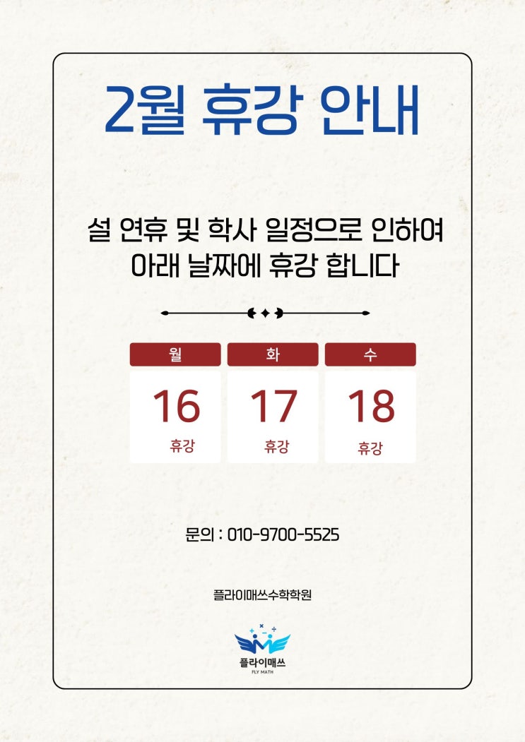 2월 16일 ~18일 휴강 19일 부터 정상수업 해오름마을에서 수학에 진심을 전하는 플라이매쓰 날개쌤입니다! 다가오는 설 명절을 맞아 2월 16일(월) ~ 2월 18일(수)까지 휴강합니다. 2월 19일(목)부터 정상수업으로 진행됩니다. 사랑하는 가족들과 따뜻하고 행복한 명절 보내시고, 아이들도 푹 쉬며 재충전하는 시간 되길 바랍니다 19일~20일 수업 변경 안내 19일~20일 이틀간 실버샘의 연수 교육 일정으로 인해 수업에 일부 변경이 있습니다. ✔ 사고력반 수업은 원장님께서 직접 대체 수업을 진행합니다. ✔ 기존 원장님 수업은 해당 기간 동안 다른 선생님께서 책임지고 수업을 진행하실 예정입니다. 아이들의 수업 흐름에 차질이 없....... <img src="https://blogthumb.pstatic.net/MjAyNjAyMTNfMjU5/MDAxNzcwOTg4MzkxODcz.Oo7K9IRc_4zA0qvPeJ6LkwcoCpms9apqyK1_nSLmcJUg.WubisgUowsuBWVHhZuDDUwFNe3HX_u67OJIy1VDCVF0g.JPEG/KakaoTalk_20260212_212559623.jpg?type=s3" />