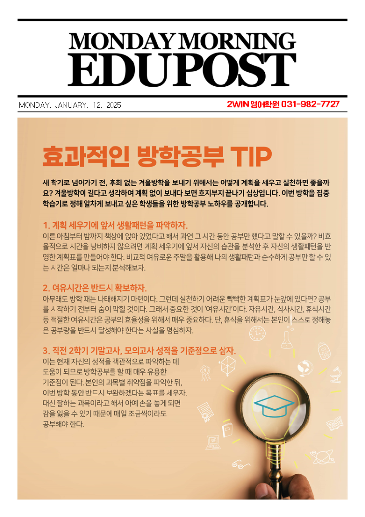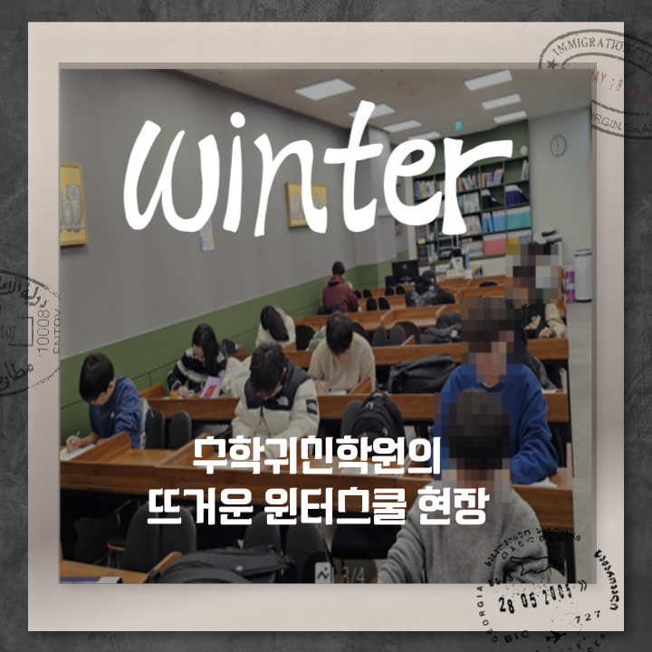 이번주부터 시작된 오전 윈터 첨삭수업이 힘차게 진행되고 있습니다. 많은 학생들이 부지런히 등원하여 배정된 일일테스트를 풀고, 정규반 숙제 및 추가 배정 교재를 풀고 있습니다. 물론 이 모든 과정에는 첨삭선생님들께서 곁에 딱 붙어서 도와주고 계십니다. 조교선생님들만이 아닌... 대표원장님과 부원장까지 모두 합세하여 빈틈없는 첨삭관리에 열을 올리고 있습니다. 힘든 일정이지만.. 스스로 선택하고, 꼬박꼬박 지켜나가고 있는 학생들을 보면서.. 다시 한번 마음속 깊이 응원을 하게 됩니다. 5주간의 빡공!!!! 끝까지 잘 해내보자~~^^ <img src="https://blogthumb.pstatic.net/MjAyNjAxMTRfMTc5/MDAxNzY4MzgzODYwODM4.R8TN9DueVIA0qcUwLn5zzMzq2greHzcSBVxCjrbSnvcg.AeyItccmKsdxxkj3s1EA_p8RvJB6jjMRMPZ11hvVY8Ug.PNG/%C0%A9%C5%CD1.png?type=s3" />