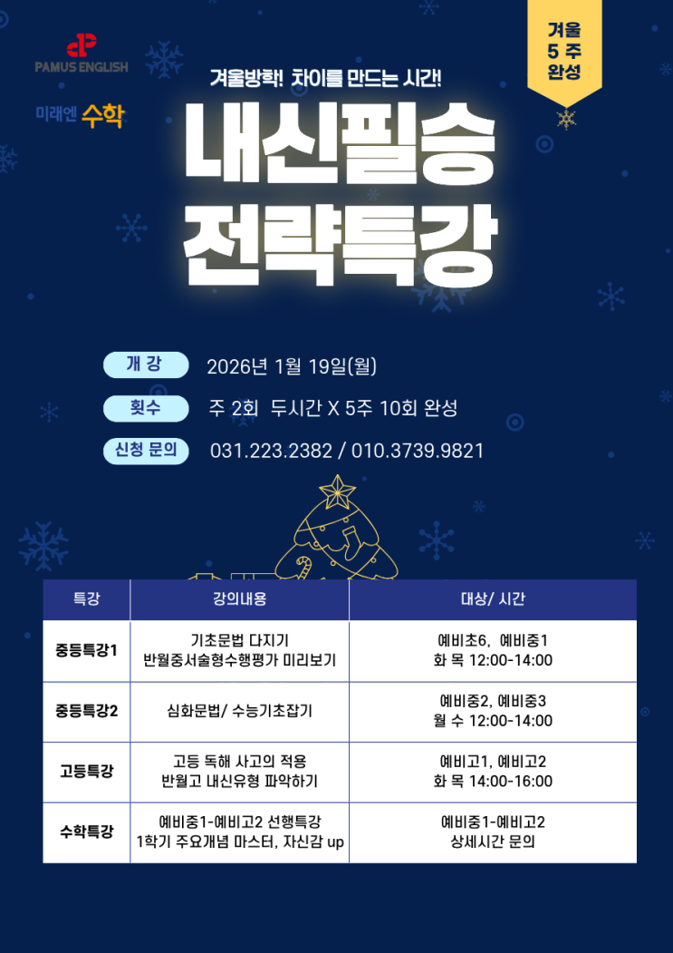 들떴던 크리스마스도 지나가고, 새해가 밝아 왔네요!! 블로그를 방문하신 모든 님들! 2026년 병오년 새해 복 많이 받으시기 바랍니다!^^ 붉은 말의 해라는 병오년, 왠지 더 역동적으로 열심히 달리는 한해가 될것 같은 느낌적인 느낌쓰! 그 어느해보다 인상적인, 감동적인 한해가 되길 바랍니다!^^ 다가오는 3월 새학기 준비는 어떻게 해야 할까요? 긴긴 겨울 여유롭다고 미루다간 어영 부영 두달이 휘리릭~~ 가지요! 공부를 미뤄 왔던 친구들이라면 특강으로 큰 전환점을 맞이 할 수도 있습니다. 겨울 방학때 착실히 농사지어 성적향상과 자신감 이라는 큰 결실을 맞이하는 친구들을 왕왕 보아 왔기 때문이죠. 앞서가는 친구들이라도 복습을 통....... <img src="https://blogthumb.pstatic.net/MjAyNjAxMDVfMTEx/MDAxNzY3NjEyNjA4MDg0.SU1j-lJOXTJPr_3Ggfzn280fb6HxgY33E1SuoXZRUJQg.TmkpgL-mtFljwMV-N7_Wy-Z6wPLDR8l_dPCMKnwzOggg.PNG/26%B0%DC%BF%EF%B9%E6%C7%D0%C0%CC%B9%CC%C1%F6.png?type=s3" />
