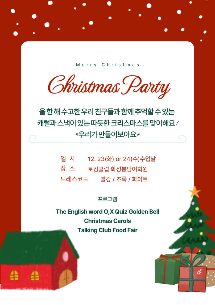 처음부터 토킹클럽! 안녕하세요 토킹클럽 화성 봉담 어학원입니다~ 지난 12월 23~24일 토킹클럽은 Christmas Theme Day를 진행하였습니다! 우선 Talking Club Food Fair를 위한 많은 종류의 음식들을 선생님들께서 준비해 주셨습니다~! Christmas Party 프로그램은 수업 시간 순으로 진행됩니다 1:50 / 3:00 / 4:10 각 반 아이들은 OX Quiz, Golden Bell, Carol 부르기를 진행하며 모두 즐거운 시간을 보냈답니다~** 1:50 3:00 4:10 4:10 타임은 초등학교를 졸업하고 중등부로 올라가는 6학년 학생들이 많습니다 Christmas Party와 함께 졸업사진도 찍어보았습니다~^^ 아이들과 함께한 웃음 가득했던 Christmas Party!!! 아이들 모두 즐거운 추억....... <img src="https://blogthumb.pstatic.net/MjAyNjAxMDZfMjYz/MDAxNzY3Njc2MjQ4Mzkz.Tj_2_4mlASzUA5WLsazwvtp_POguNpRCIWsMQFGmd4wg.tmiUH7Z9H1w0HdgIqGFmQwuyIxVroWOb2rIWbbuo8PUg.PNG/%BE%C8%B3%BB%C4%AB%B5%E5.png?type=s3" />