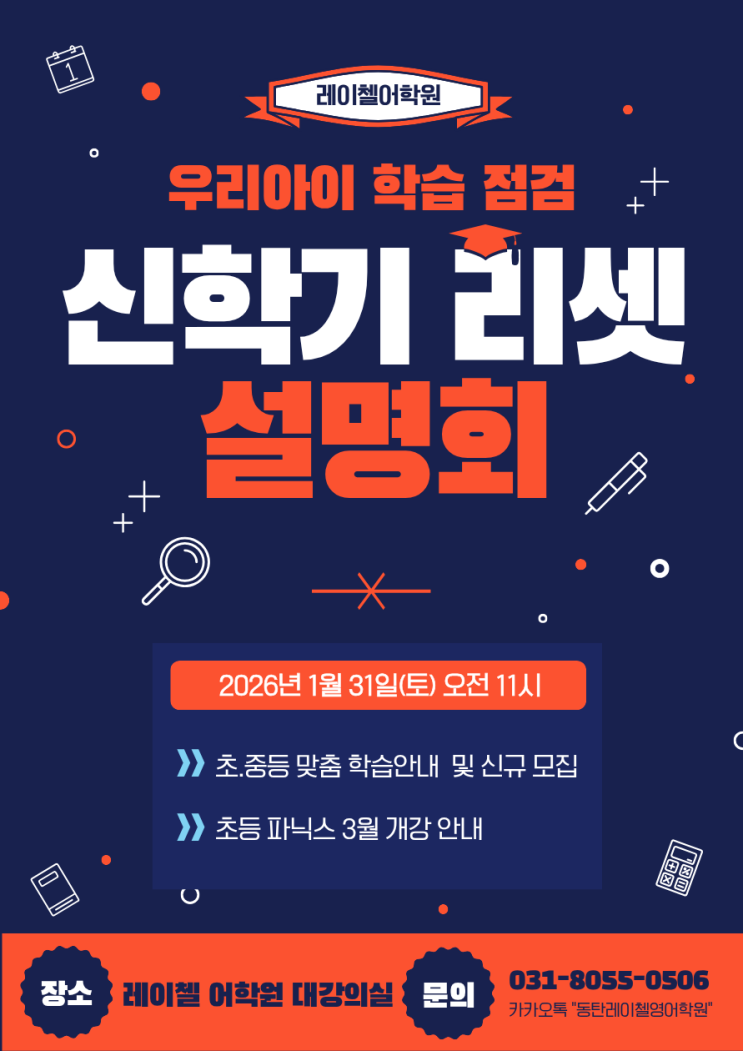 안녕하세요~ 영어의 시작과 끝. 초중고 영어 연계 전문 레이첼어학원 입니다. 드디어 2026년 새해가 밝았습니다!! 저희 레이첼어학원은 엎서 포스팅해드린 1,2월 방학특강의 첫 수업을 힘차게 시작하고 모든 학생들이 열심히 학습에 매진 하고 있습니다. 오늘은 우리아이 학습점검, 2026 신학기 리셋 설명회와 3월 파닉스반 개강 소식 함께 전해 드립니다 ^^ 이번 설명회는 우리아이가 지금 맞는 방향과 속도로 영어 학습을 잘 꾸려가고 있는지 살펴보고 그에맞는 로드맵을 가지고 3월 신학기를 탄탄하게 준비하는 시간입니다. 초,중 통합설명회로 진행되며 시간은 약 40분 소요, 후에 질의응답 또는 1:1 개별상담 등이 이뤄집니다. 시간관계상 설....... <img src="https://blogthumb.pstatic.net/MjAyNjAxMDdfMjAw/MDAxNzY3NzIyMTUwMjMz.LMIIEzsiC90RCP8CQwzdiq3qJVXoF9tH7GGFCzzvBfgg.dZyk-UB75gjoCznvkcjdyBvlyAQuMhaVPgVucfhCbzkg.PNG/26%B3%E2_%BC%B3%B8%ED%C8%B8.png?type=s3" />
