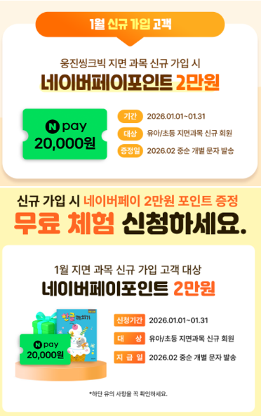 “무료 체험 + 네이버페이 2만 원 받는 기회, 지금 아니면 못 잡아요!” 안녕하세요 새 학기를 앞두고 우리 아이 학습을 준비하는 학부모님들께 정말 알짜배기 소식을 전해드립니다. 1월에만! 신규 가입 시 네이버페이 2만 원 지급 웅진씽크빅 지면 과목 신규 가입 회원에게 네이버페이 포인트 20,000원이 지급됩니다! 기간 : 2026.01.01 ~ 01.31 대상 : 유아/초등 지면 과목 신규 회원 지급일 : 2026.02 중순 개별 문자 발송 가입만 해도 2만 원이 쏙! 아이 학습도 챙기고 생활비에도 도움이 되는 실속 혜택이에요. ✨ 무료 체험 신청만 해도 혜택이! 신규 가입을 고민 중이신가요? 그렇다면 먼저 부담 없이 무료 체험부터 받아보세요....... <img src="https://blogthumb.pstatic.net/MjAyNjAxMDdfNTMg/MDAxNzY3Nzg5NzEzMzQ3.vOsjPiAowYBz4S3qvZhtLUXS0LUufAAtrvbTIgkr2cgg.2h1qwrB5x7-hTHtt90HsLpAViJo9yl_okPhZbf1bp2Qg.PNG/%BD%BA%C5%A9%B8%B0%BC%A6_2026-01-07_185305.png?type=s3" />