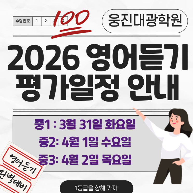 안녕하세요! 양주 영어전문 전과목 올백 학원 웅진대광학원 Joy 입니다:) 2026년 전국 중고등학생 영어듣기능력평가 일정을 안내드립니다 중학교 1학년은 3월 31일 화요일 중학교 2학년은 다음날인 4월 1일 수요일 중학교 3학년은 다음날인 4월 2일 목요일 듣기평가를 치르게 됩니다. 주관 : 전국 16개 시/도 교육청 학년별 각 20문항 / 5지 선다형 미국인 영어발음(영국인 발음X) 우리대광학원 중학생들은 능률 영어듣기 모의고사로 기출문제 및 모의고사를 전범위 완벽 대비하였고 최대 1개 틀린 경우를 제외하고는 모두 영어듣기 만점으로 방학동안 준비하였습니다. 평가가 없는 중1의 경우 상반기 그리고 하반기에 있는 영어듣기능력평가가 아....... <img src="https://blogthumb.pstatic.net/MjAyNjAzMjRfMjA3/MDAxNzc0MzIyNjkxOTUw.7GXT7mk8cCUHgmJDtbi8sqi1u9Phg5n6zmJrSQIVDvog.gM5eRZTQbNniy1FeIB3R9cNl7JZj_oVZEejU3ooW9oAg.PNG/2026%BF%B5%BE%EE%B5%E8%B1%E2%C6%F2%B0%A1%C0%CF%C1%A4%BE%C8%B3%BB.png?type=s3" />
