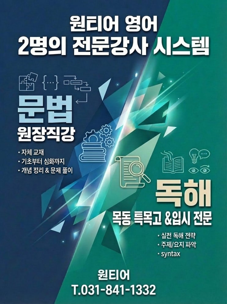 초등 때까지는 단어랑 본문 위주로도 성적이 나오지만, 중등부터는 문법과 독해를 얼마나 정확하게 이해하느냐에 따라 성적 차이가 확실히 벌어집니다. 특히 많은 아이들이 문법을 “외우는 것”으로 접근하다 보니 막상 문제에서는 적용을 어려워하는 경우가 많더라고요. 그래서 원티어 영어학원에서는 한 명의 선생님이 모두 가르치는 방식이 아니라 파트별 전문 수업으로 진행하고 있습니다. ✔️ 그래머(문법) → 원장 직강 문법은 기초가 흔들리면 계속 무너지기 때문에 개념부터 내신까지 꼼꼼하게 잡아줍니다. 무엇보다 아이들이 문법을 어려워하는 이유가 “이해 없이 암기”하기 때문이라고 생각해서, 각 문법 단원마다 자체....... <img src="https://blogthumb.pstatic.net/MjAyNjAzMjVfMTA0/MDAxNzc0NDI4MjMyNTc5.panILzVyUWb8tp8Itfu5XyfeWShmfQmCJDukYeSIlW0g.kXMYV2vBTx_rSp8ZFfX_Qc9vdBn2UsDR8Sa7cBQL8F8g.JPEG/KakaoTalk_20260324_144229.jpg?type=s3" />