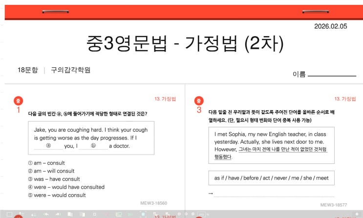 2/12(목)예비고1 일정: 2/19(목) 23년 3월 고1모고 -변형시험(18번~45번) 객/주관식 일정: 보강: 3/2(월) 대체공휴일 12~3시 + 4시까지(셤 여부에 따라 바뀝니다.) 2/20 금 -> 25년 3월 고1모고 시작 2/11 건고예비소집일 : 시간 동일 11시 반 시작 수업 독해 단어 28 시험 - 보류 문법 가정법 프린트 1차, 2차 시험 응시 및 문제풀이 과제 : 모의고사 워크시트 - 밀린것 전부 해야해요. (명절~) 가정법 프린트 1차 및 2차 시험 - 오답노트쓰기 문법책 가정법 단원평가 풀어오기 (271~274쪽) 독해 단어 28, 29 외워오기 + 단어클카 2개요 <img src="https://phinf.pstatic.net/image.nmv/blog_2026_02_12_351/khWWTG4OnT_01.jpg?type=f480x480" />