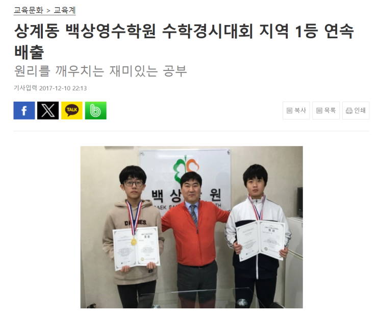 “가르치는 티칭보단 도와주는 티칭” 한 신문기사에서는 많은 학생들이 싫어하는 과목인 수학을 ‘풀어가는 과정이 재미있다’고 말하는 학생들과 원장님의 이야기가 함께 담겨 있습니다. 그 차이는 어디에서 만들어졌을까요? 기사 속 백상학원의 수업 방식에서, 그 기준을 확인할 수 있었습니다. 1. “문제집보다 중요한 것은 개념을 구체화하는 것” 신문기사에서 백상학원 원장님은 분명하게 말합니다. “경시대회 준비는 문제집보다는 개념을 구체화하는 것이 중요하다.” 천재교육이 주최하는 HME 수학경시대회는 계산력, 이해력, 추론력, 문제 해결력을 종합적으로 평가하는 시험입니다. 단순 반복 학습으로는 성과를 내기 어려운 구조입....... <img src="https://blogthumb.pstatic.net/MjAyNjAyMTFfMTI5/MDAxNzcwNzk3NDgxNjI2.2SNqd-Kc_8c3BkBY3LPZawU8qDFiqHriCA0xU74-sbcg.5yr6o67yoTfh4wuQvuM9Dsg-zP9ulgyPZpEenf8S8n8g.PNG/%C8%AD%B8%E9_%C4%B8%C3%B3_2026-02-11_171033.png?type=s3" />