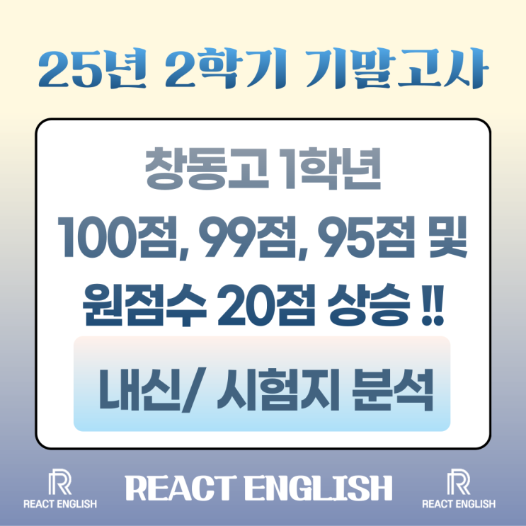 안녕하세요, 리액트영어학원입니다. 창동고 1학년의 25학년도 마지막 내신 시험인 2학기 기말고사가 모두 마무리되었습니다. 이번 시험에서 리액트영어학원 재원생들 중 100점, 99점, 95점 등 90점대 고득점 학생들이 다수 배출되었고, 원점수가 눈에 띄게 상승한 사례들 또한 여러 명 확인되었습니다. 특히 50점대에서 70점대로 20점 이상 상승한 학생도 있어, 준비 방향이 올바르게 작동하고 있음을 다시 한 번 확인할 수 있었습니다. 1학년 내신을 마무리하는 시험인 만큼 앞으로 이어질 2학년 내신과 수능 학습의 방향을 가늠할 수 있는 중요한 기준점이기도 했습니다. 시험 직후 리액트 재원생들의 문자 2025학년도 2학기 기말고사 [ 공통영....... <img src="https://blogthumb.pstatic.net/MjAyNTEyMjNfNDEg/MDAxNzY2NDgzNzM5OTk3.O7jxu97_BKZu08IX_5Cq0Seg3iGKD4NjjJQC2zr-Cckg.TEIZe5ftswkD41mski38_6_B4AdBFtDnoepv561bzuQg.PNG/065.png?type=s3" />