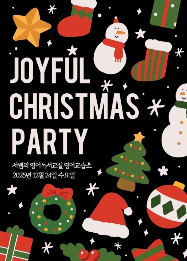 안녕하세요 ~^^ 도봉구 쌍문동 백운초 앞 영어학원 영어독서교실 고심하는 서쌤입니다. 정말 오랫만에 이벤트 데이로 돌아왔습니다. 오늘은 방학식이면서 크리스마스 이브입니다. 이벤트를 안할수가 없겠죠?! ^^ 오늘은 퀴즈배틀도 하고 빙고게임도 하고 다양한 노래(Nursery Rhymes, Carol Songs)도 배워볼 예정이랍니다. 아이들과 함께 먹을 간식세트(팝콘치킨과 컵떡볶이)도 준비했습니다. 아이들이 좋아하겠지요?! 마지막으로 크리스마스 선물도 준비했습니다. 스페셜 수제 캔디와 붕어빵 손난로입니다. 너무 이쁘고 귀엽죠?!!!^^ 아이들이 좋아해주면 좋겠어요.^^ 오늘도 즐거운 이벤트데이로 좋은 추억 남겨보도록 하겠습니다~ 감사합니다....... <img src="https://blogthumb.pstatic.net/MjAyNTEyMjRfOTEg/MDAxNzY2NTQ2OTQwMjk5.K9klDuGZgvGRU2QzgVX2p4g9ac2R3ps8VVdNunWwznIg.8VgR_J0raugUCTb-S3LrbaKDJXb3pF7y112WQv5ejrIg.JPEG/900%A3%DF1766462896402.jpg?type=s3" />
