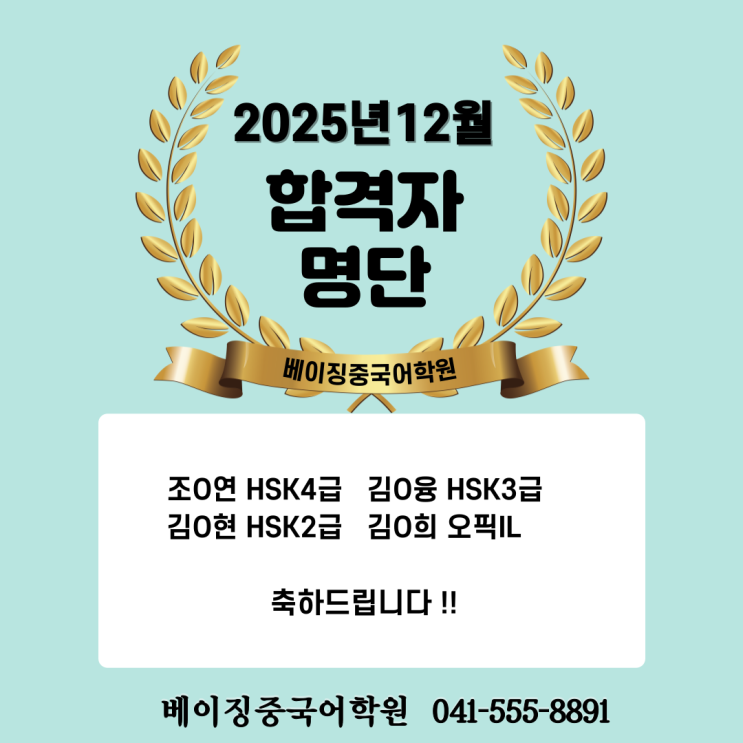 안녕하세요. 천안중국어학원 베이징 입니다 _) 1월 건강하게 잘 보내고 계신가요? 어제는 눈바람이 몰아치더니 날씨가 급격하게 영하로 떨어졌더라구요 이런날 건강 조심하셔야 합니다! 우리 모두 남은 1월도 즐겁고 해피하게 보내요~! 오늘은 2025년 12월 합격자 명단을 안내해드릴려구 합니다! 열심히 준비해주시고 같이 따라와주신 합격자 분들 좋은 성적을 거둬서 정말 자랑스럽고 뿌듯합니다! 합격을 진심으로 축하드립니다 ^^ 아무쪼록 하고자 하는 모든 나날들이 꼭 좋은 행운을 가져다주길 천안베이징중국어학원에서 응원하겠습니다! 천안중국어학원 베이징은 언제든 열려있습니다. 궁금하신 사항이나 상담문의가 필요하신 분들은 언제든....... <img src="https://blogthumb.pstatic.net/MjAyNjAxMTFfMTIy/MDAxNzY4MTA4Mjc4MDA5.J9oTJLIL9IBoaUc4tbeJqpIHxQVpYOLDrfyqBwDdhTcg.fXE22BIVBkNlgFYlvoug8vTBueayQqrj6nVhLidLKGMg.PNG/KakaoTalk_20260111_140144485_03.png?type=s3" />
