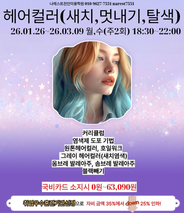 안녕하세요 나레스트천안미용학원 입니다. 염색 하나로 고객 만족도 100%! 감각적인 컬러 표현부터 탈색 리터치까지 진짜 실력을 갖춘 헤어컬러 전문가로 성장하고 싶다면, 이번 헤어컬러 수업 추천드립니다 헤어컬러(새치,멋내기,탈색) 26.01.26~26.03.09 월,수(주2회) 18:30~22:00 ✅ 현장에서 바로 쓰는 기술 습득 살롱에서 가장 많이 하는 시술(새치·멋내기·탈색)을 중심으로 실제 고객 상황에 바로 적용 가능한 테크닉을 배웁니다. ✅ 정확한 컬러 설계 능력 향상 색채이론 + 모발이론 + 도포법을 한 번에 연결해 고객이 원하는 컬러를 예측 → 설계 → 완성까지 가능하게 합니다. 소수 정예 수업으로 밀착 지도 대형 미용학원의 문....... <img src="https://blogthumb.pstatic.net/MjAyNjAxMThfMTQ4/MDAxNzY4NzE2MDcxNzE1.4Xebgn41vKBM4Lw5Q4PZjZfZ-vVrTsLUMmvREh8G3UEg.hsF03kmyRCuH2monqGbQVqouPOeJRCrhVdWbxARfrgUg.JPEG/%C1%A6%B8%F1%C0%BB_%C0%D4%B7%C2%C7%D8%C1%D6%BC%BC%BF%E4._%2836%29.jpg?type=s3" />