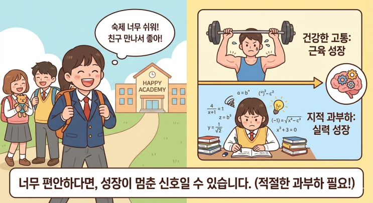 학원을 옮기는 것은 아이에게도 부모님께도 큰 결정입니다. 하지만 가장 안타까운 상황은 '성장 없이 시간만 흐르는 것'입니다. 좋은 학원의 기준은 명확합니다. "아이가 꾸준히 성장하고 있는가?"입니다. 보통 성장은 계단식으로 이루어지기 때문에 정체기가 있을 수 있지만, 아래의 세 가지 신호가 보인다면 이제는 결단이 필요한 때일지 모릅니다. 1. 아이가 학원을 너무 '즐겁게만' 다니고 있지는 않나요? 수학 실력은 적절한 '지적 과부하'를 견뎌낼 때 비로소 성장합니다. 운동을 할 때 근육이 미세하게 찢어지며 단단해 지듯이, 공부도 모르는 문제를 붙들고 고민하는 건강한 고통의 시간이 필수....... <img src="https://blogthumb.pstatic.net/MjAyNjAxMTlfOTAg/MDAxNzY4NzUxMTM1NTk0.l5QSNqfSTiZx0E2w_RN9YKjnSANy0F4I_A24nyfuLvkg.DeqRvoV9a-dIqc2YBQNsfWxY1TKLuTg2X0FeIHmypZQg.PNG/Gemini_Generated_Image_rdyon9rdyon9rdyo_%281%29.png?type=s3" />