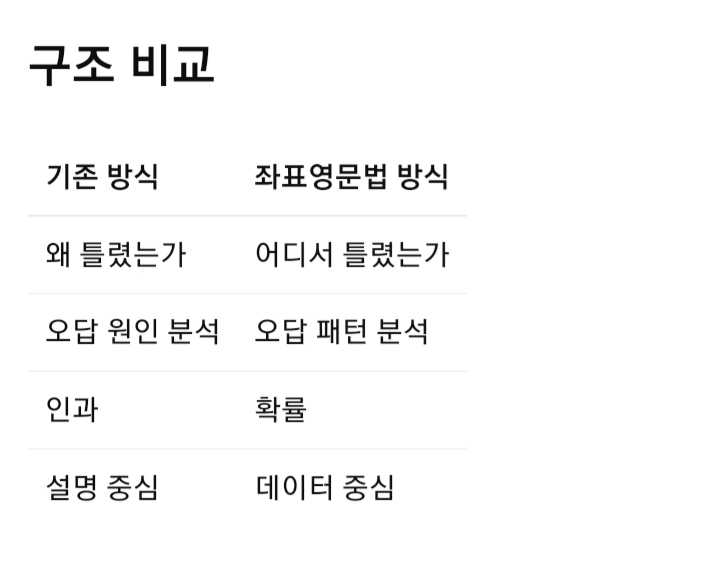 서론: "왜 열심히 하는데 성적은 제자리일까?" 라는 질문에 대하여 수많은 학생이 오답 노트를 만들고, 지문을 토씨 하나 틀리지 않게 완벽히 해석하려 밤을 지새웁니다. 하지만 투입한 노력에 비해 성적은 요지부동인 '성적 정체기'를 경험하곤 합니다. 인지 심리학과 데이터 분석의 관점에서 볼 때, 이는 노력이 부족해서가 아니라 학습의 패러다임이 잘못되었기 때문입니다. 전통적인 학습이 개별적인 실수를 교정하려는 '노력 중심'의 사후 처리에 머물렀다면, 이제는 학습을 '데이터 중심'의 과학적 관리 영역으로 전환해야 합니다. 영어를 단순한 암기 과목이 아닌, 체계적으로 설계된 '좌표....... <img src="https://blogthumb.pstatic.net/MjAyNjAzMTNfMTM3/MDAxNzczMzg4NjI1MTg1.T3OZOI87MIMtvxwHi6-VplNmiV78aGRdjHp7so_ByKgg.8zXTtjGZaXGxZfJ5hhhWRsqDQalxoUqBucned73QeQcg.JPEG/%BE%EE%B5%F0%BC%AD_%C6%B2%B7%C8%B4%C2%B0%A1.jpg?type=s3" />
