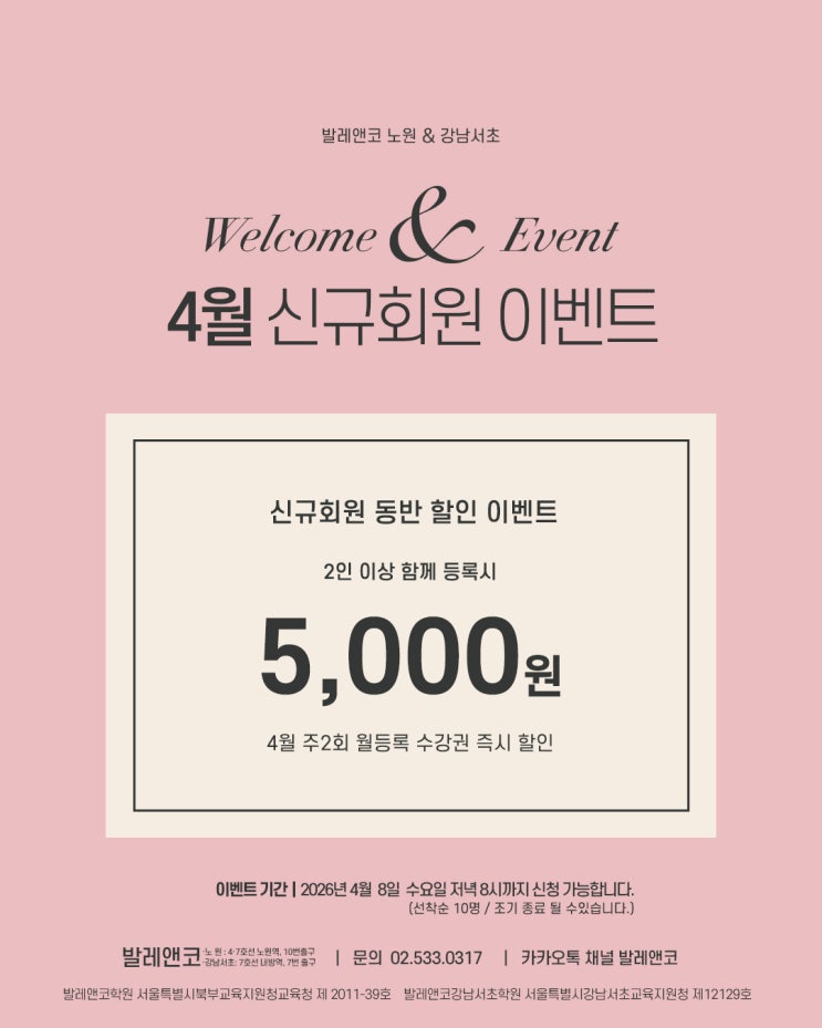 · 이벤트 기간 | ~ 2026년 4월 8일 수요일 저녁 8시까지 · 이벤트 지점 | 발레앤코 노원&강남서초 · 이벤트 안내 | 4월 주2회 월등록 2인 이상 등록시 각 5,000원 할인 · 이벤트 대상 | 발레앤코가 처음인 신규회원 대상 발레앤코 노원&강남서초 4월 신규회원 이벤트 발레를 시작하고 싶었지만 “혼자라서 망설였던 분들” 많으시죠? 그래서 준비했어요 같이 등록하면 할인되는 4월 한정 이벤트! ♀️ 신규회원 동반 할인 이벤트 ✔ 친구, 가족, 지인과 함께 등록 시 각 5,000원 할인 적용 ✔ 조건 : 4월 주 2회 월등록 수강 시 할인 적용 수강권 안내 비기너 (입문자 추천) ✔ 발레 처음 / 6개월 미만 ✔ 기초부터 차....... <img src="https://blogthumb.pstatic.net/MjAyNjAzMTlfNjUg/MDAxNzczOTAyMDQ2Mjcy.isqzgRbp90Lombg7KOgTxQ7oZDJ8s3Y95H8jAyY5ed0g.JsVPrZ2a3vVn1UD_CdZV9S_0IxESk-qzOGmk4Rd4dAEg.JPEG/4%BF%F9%C0%CC%BA%A5%C6%AE_%BD%C5%B1%D4.jpg?type=s3" />