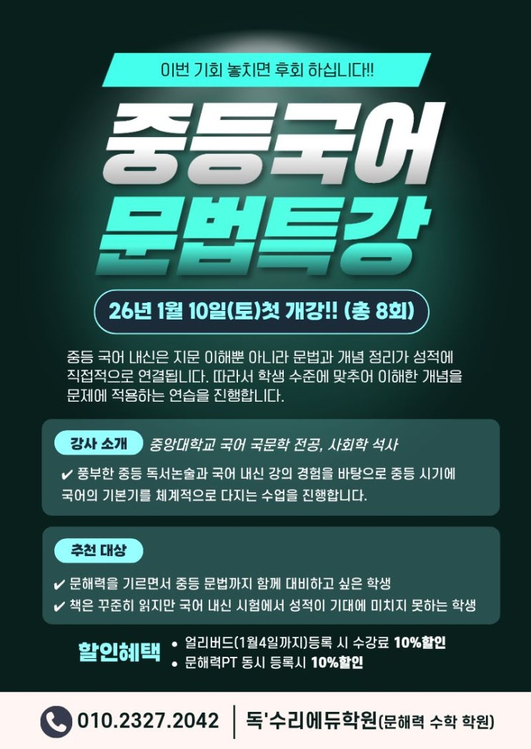 안녕하세요. 독수리에듀학원 박원장입니다. 중학교 3년은 국어 실력이 만들어지는 시간이지, 시험 대비만 하는 시기가 아닙니다. ✔ 고1 첫 모의고사 등급이 ✔ 거의 고3까지그대로 유지되는 현실 이 말은 곧, 고등 국어의 승부는 중등에서 이미 갈린다는 뜻입니다. 그런데도 아직 많은 아이들이 중등 시기에 막연하게 ‘독서만’ 하고 있거나 내신위주의 공부만 하고 있습니다. 물론 독서는 중요합니다. 국어의 뿌리이자 생각의 재료이니까요. 하지만 ❝독서만으로 국어 실력이 완성되지는 않습니다.❞ 중등 시기에는 반드시 읽은 내용을 • 구조로 파악하고 • 중심을 잡고 • 근거로 설명하고 • 문제로 연결하는 국어 학습 훈련이 함께 들어....... <img src="https://blogthumb.pstatic.net/MjAyNjAxMDZfMTQ0/MDAxNzY3NjQxMTI2NDUw.YoMezee-aSTggPbilb8bYTe1Va8rNJWpHb5sznSxxN4g.Za05PVkdDhLEDyx03lhDgMS_kAecqfZBktYRePm8mbQg.JPEG/1767315518161.jpg?type=s3" />