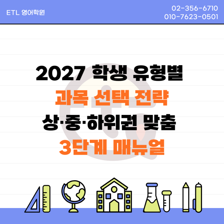 안녕하세요! ETL 영어학원 입니다 2027학년도부터 교과평가·학생부종합전형에서 ‘과목 선택’의 중요성이 더욱 커졌습니다. 이제 과목 선택은 단순한 시간표 구성이 아니라, ✔ 학업 역량 ✔ 진로 적합성 ✔ 세특(세부능력특기사항) ✔ 수능 대비 까지 모두 연결되는 입시 전략의 핵심입니다. 특히 학생의 현재 성적 수준에 따라 과목 선택 방식은 완전히 달라져야 합니다. 지금부터 상·중·하위권 학생별 과목 선택 전략을 단계별로 정리해 드립니다. [유형 A. 상위권 학생 (내신 1.0 ~ 3.0)] 핵심 전략 “깊이 + 연계 + 위계 유지” 상위권 학생들이 가장 많이 하는 실수는 ‘성적만 유지하면 된다’는 단순 전략입니다. 상위권일수록 과....... <img src="https://blogthumb.pstatic.net/MjAyNjAxMTNfNiAg/MDAxNzY4MzAxNjMxNTQ0.4c9yjTGyYzemGkkWtZ83rbvdp9yTH4j19ggg0l5Ks3Ug.o6QWuvkY0ZQ7BJZr2G80jm7pLrUFJiKcD2sUKxkqydwg.PNG/%BA%ED%B7%CE%B1%D7_%B4%EB%C7%A5%C0%CC%B9%CC%C1%F6-001_%284%29.png?type=s3" />