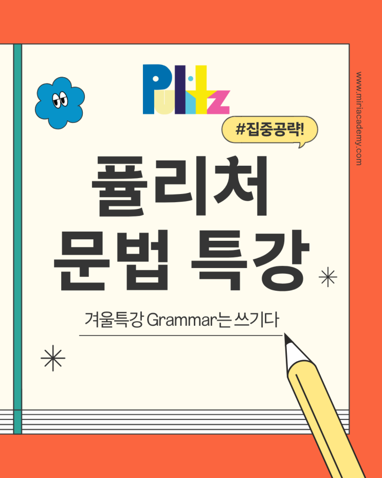 안녕하세요, 퓰리처영어학원입니다. 영어 문법이 어렵게 느껴지시나요? 방학기간만큼 문법을 제대로 잡을 수 있는 기간이 없죠. 방학 기간에 문법을 완성해두면 학기중에는 쓰기/서술형이 편해집니다. 퓰리처의 문법특강은 문법을 문장으로 훈련하여, 성적으로 직결시켜줍니다. ✔️ 핵심 문법 정리 + 적용 ✔️ 배운 문법은 그날 바로 적용해서 고정 ✔️ “풀 줄 아는 문법”이 아니라 “쓸 줄 아는 문법” 'Grammar는 쓰기다' 기본과정은 성황리에 마무리되었으며, 남은 일정은 다음과 같습니다 : Grammar는 쓰기다 심화과정 : 2026. 1. 28 ~ 2. 24 Grammar는 쓰기다 초등과정 : 2026. 1. 29 ~ 2. 24 오랜 기간 이촌동 학....... <img src="https://blogthumb.pstatic.net/MjAyNjAxMjlfMjk0/MDAxNzY5NjkyMTQ4MDM5.0GjC6aGbosqf3YS_47pW87-MbE-gG1zv5UIbr1aL4Tgg.-kJq_Cx8LcfcOl-8J-dT1ZhjeWikw9UMFikMxEoIx8Eg.PNG/1.png?type=s3" />