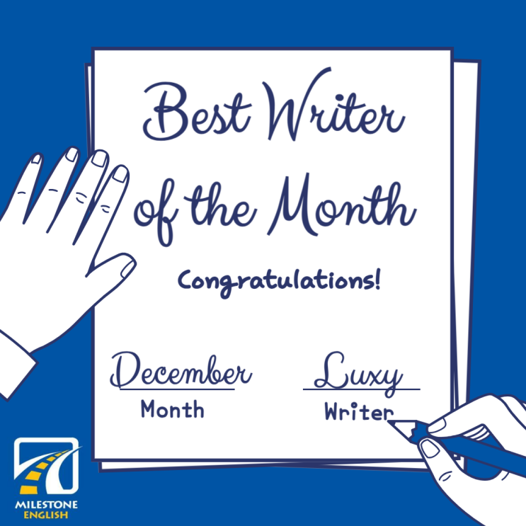 안녕하세요, 파닉스 기초부터 원서 읽기, 에세이 쓰기까지 아이들이 영어를 제대로 배울 수 있도록 지도하는 마일스톤 어학원입니다. 마일스톤 어학원에서는 아이들이 영어 일기와 에세이를 더 즐겁고 꾸준히 써 나갈 수 있도록 매달 Best Writer를 선정해 시상하고 있습니다. 12월 Best Writer는 바로 Lucy입니다! Lucy는 “My Plan for Winter Vacation”이라는 주제로 겨울방학 동안의 일상을 솔직하게 표현해 주었어요. 특히 TV 시청, Lucy의 취미인 그림 그리기, 가족과의 시간, 학원 계획까지 자신의 방학 생활을 구체적인 문장으로 자연스럽게 구성해 읽는 사람이 쉽게 공감할 수 있는 글을 완성했습니다. 또한 글의 마지막....... <img src="https://blogthumb.pstatic.net/MjAyNjAxMjlfNzAg/MDAxNzY5NjU5MjAyODkx.m6ZWxtpIhZMFyv-M4U2WK7CigY7yVyYV4gnwy81oASIg.Tkib-ihO4R0qoPDDy1HQmQlDGnxhC6kDAlfUxXFELs8g.PNG/dec_lucy-001.png?type=s3" />