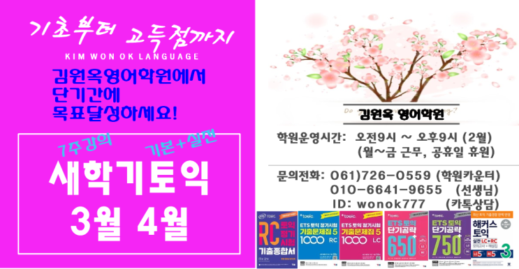 안녕하세요^^ 순천토익학원 김원옥영어학원입니다. 희망찬 2026년을 시작하는 1월 여러분들은 알차게 잘 지내셨나요? 저희학원은 새해의 설렘을 느낄새도 없이 아주 바쁜 겨울을 보냈습니다. 아침부터 연달아 있는 세개의 토익특강과 정원마감되었음에도 계속되는 문의전화, 각반의 자료준비, 밤늦게까지 있는 중고등수업들... 바쁜 나날을 보내다 보니 어느덧 1월이 순삭되었습니다. 특히 원장님은 쉬는 날 없이, 쉴 틈없이, 매일 아침부터 밤까지, 수업하셔서 하루하루가 엄청 길었을텐데... 그 한달을 견뎌내시다니.. 이제 남은 토익특강은 3주. 모의고사 문제풀이로 진행하고 있는데 이때가 가장 점수를 많이 올릴수 있는 시기이니, 수강생들....... <img src="https://blogthumb.pstatic.net/MjAyNjAyMDNfNjAg/MDAxNzcwMDg5OTc3NTYy.AWyYrP_OJaZlkekfenGmfEHLSv-E8dYnlwX0Ro_Xtn4g.m8T4X9-vPiTmu4F8CC5i7XZAvbgmqsJCdB--Tay6mwUg.PNG/image.png?type=s3" />