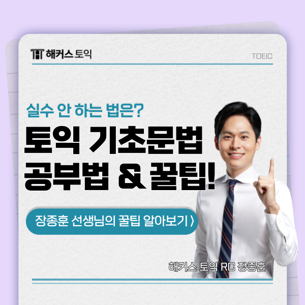 안녕하세요 여러분~ 블로그지기입니다! :) TOEIC을 공부할 때 RC 문법 영역으로 인해 어려움을 느끼는 분들은 주목해 주세요! 이번 포스팅에서는 장종훈 선생님께서 문법이 어려운 분들을 위해 토익 문법 문제를 풀 때 실수하지 않고 풀 수 있는 꿀팁을 알려주신다고 합니다. 문제의 유형에 따라 기초 입문자분들을 위한 풀이법을 함께 확인해 보러 가볼까요~? 토익 문법 문제 풀이법 & 꿀팁 확인! 첫 번째 문제부터 함께 보시겠습니다. 보자마자 '문법'에 대한 문제라는 걸 알 수 있겠죠? 이런 경우에는 분석으로 접근하셔야 합니다. 여기서 분석이란 해당 보기 및 빈칸이 어떤 역할을 하는 곳인지를 파악하는 것입니다. 이제 문....... <img src="https://blogthumb.pstatic.net/MjAyNjAzMzBfMTIy/MDAxNzc0ODQ2NjMxNTQw.SovLvfTIQKHd3pxCaR3imZ7_qrwzWnF5ZVsrmQexHkIg.71DZRDwkrmYUVAAMAjB7fBEuXlwR2CfNYGnJujfx5_0g.PNG/%C5%E4%C0%CD%B9%AE%B9%FD%B9%AE%C1%A6.png?type=s3" />