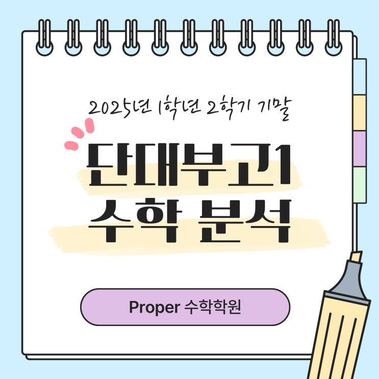 안녕하세요! 프로퍼 수학학원입니다 오늘은 많은 학생과 학부모님들께서 궁금해하셨을 단대부고 1학년 2학기 수학 기말고사를 분석해보겠습니다. 1️⃣ 출제 구성 및 경향 이번 기말고사는 전반적으로 학교 수업과 프린트에 충실한 구성이었습니다. 객관식 17문항 단답형 3문항 서술형 2문항 학교 프린트 연계 문항 9문항 출제 특히 객관식 1번~11번은 기본 개념만 정확히 알고 있다면 어렵지 않게 풀 수 있는 문제들이었습니다. 2️⃣ 총평 : “쉽지만 더 무서운 시험” ✔️ 평이한 난이도 기존 단대부고 시험에서 자주 등장하던 킬러 문항이나 생소한 신유형이 거의 출제되지 않았습니다. 전반적으로 학생들이 편안하게 접근할 수 있....... <img src="https://blogthumb.pstatic.net/MjAyNjAxMDRfMjc4/MDAxNzY3NTIxMTM3NzY5.lb4K0koj1kGFFE9_jv2-lkkMere84Dnh8z6rmz24Fgkg.ZF69cOKCaM74-IvBtAfpdZBPrGMGu66RCSposUV1tgMg.PNG/1.png?type=s3" />