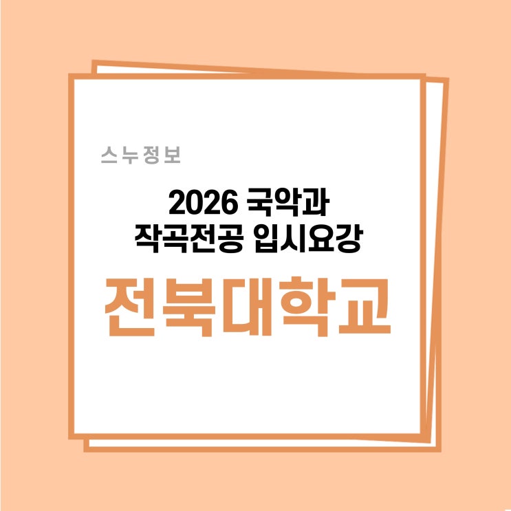 안녕하세요, 스누국악입니다. ☃️ 오늘 전해드릴 2026학년도 국악작곡전공 입시요강 시리즈는 ‘전북대학교’ 편입니다. 전북대학교 예술대학에는 '한국음악학과'라는 이름으로 국악과가 개설되어 있는데요, 전통음악의 계승과 발전이라는 1차적인 목표 아래 궁극적으로는 우리음악의 대중화와 세계화를 이끌 음악 인재를 양성하는 학과입니다. 전북지역이 전통음악의 발상지인만큼 전북대 한국음악과에서는 특성화된 맞춤형 프로그램을 도입하여 운영하고 있는데요! 전북대 한국음악학과 특성화 프로그램 ∙ 맞춤형 예술인재 양성 프로그램: 현악, 관악, 성악, 타악, 창작(작곡), 이론, 예술경영으로 학부 전공 세분 ∙ 문화예....... <img src="https://blogthumb.pstatic.net/MjAyNjAxMTRfMjc4/MDAxNzY4MzgyOTUzMjYw.1uD4YaWNdf1YrED5X16Uwd373K24Mc4gLZJslaUdiCwg.Bpci5DBSByF0xTr_P1305C4DLNS6Cr5Eu1wn5nBQ0Ygg.JPEG/%BD%BD%B6%F3%C0%CC%B5%E51.jpeg?type=s3" />