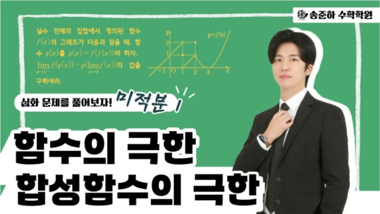 안녕하세요! 최고의 대치동수학학원 송준하수학학원입니다! 오늘도 최선을 다하겠습니다! 합성함수의 극한 유형문제 오늘은 미적분1의 1단원 함수의 극한 단원에서 나오는 문제인 합성함수의 극한에 관한 문제를 풀어보겠습니다! 궁금하신 사항이 있으면 댓글로 물어봐주세요! <해설 강의> <풀이과정> 1. 합성함수의 극한 구하기 2. 극한값의 정의를 이용하여 함숫값 구하기 #극한 #합성함수 #미정계수 #그래프 #문제풀이 #대치동 #대치동수학학원 #대치동내신대비 #대치동수능대비 #휘문고 #중동고 #보인고 #영동일고 #중대부고 #단대부고 #진선여고 #경기여고 #경기고 #반포고 #보성고 #세화고 #세화여고 #중간고사 #기말고사 #수....... <img src="https://blogthumb.pstatic.net/MjAyNjAyMDhfMjk5/MDAxNzcwNTI2MDExMTUx.gZjQS8ch9TwPg9XdYwGt5b3D_BIJxkPYQ1UiDCaHDiMg.gqLI1bUGdkzhnVFIiWJwpHve5pSugsEWymt23Y0Mxawg.JPEG/900%A3%DF260206_%B9%CC%C0%FB%BA%D01_%C7%D5%BC%BA%C7%D4%BC%F6%C0%C7_%B1%D8%C7%D1%A3%ADCover.jpg?type=s3" />