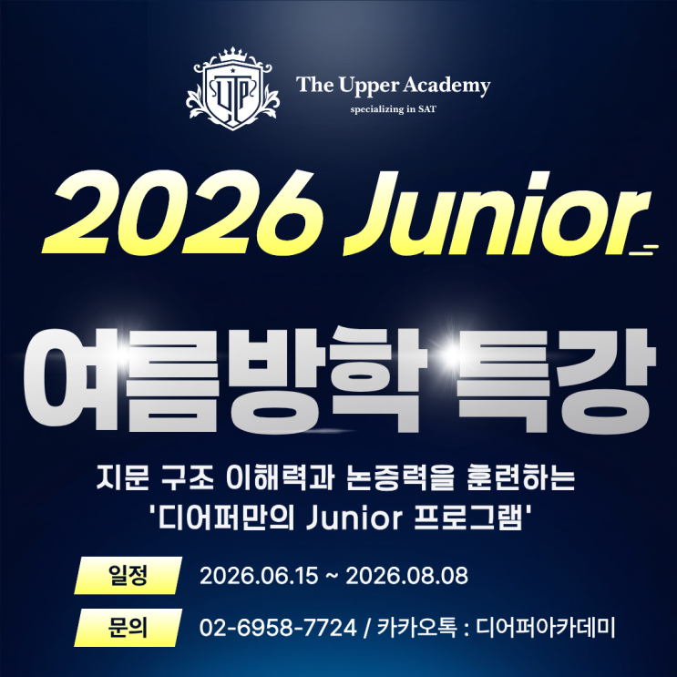 안녕하세요! Digital 전문 학원 The Upper Academy입니다. 디어퍼 아카데미는 그동안 디지털 SAT 전문학원으로서, 기출문제 중심의 날카로운 분석과 맞춤형 디지털 관리 시스템을 통해, 개원 1년 만에 압도적인 성과로 실력을 증명해 왔습니다. 하지만 그 과정에서 학부모님들께서 고민하시던 부분 중 하나는, '아이의 영어 기본기가 탄탄하지 않아 괜찮을지 모르겠다' 였습니다. 디어퍼는 이 고민을 함께 해결해드리고 싶었습니다. 급하게 쌓아 올린 성적은 금방 무너지지만, 제대로 다져진 실력은 배신하지 않습니다. 이번 여름부터 그 '기본'의 해답을 담은 주니어 프로그램을 시작합니다. 어떤 프로그램인가요? "Ju....... <img src="https://blogthumb.pstatic.net/MjAyNjAyMTBfMTY1/MDAxNzcwNzEyNTcwMjky.OxV5jQDfFQnuaZ9TA2YWhh_iqiSMwcMxWb6ANKdRmWQg.7LAYJ40ZLxLHtwGItzNj8nw63EMZ-EM21Ez81QYz2lAg.PNG/%C1%D6%B4%CF%BE%EE_%BF%A9%B8%A7.png?type=s3" />
