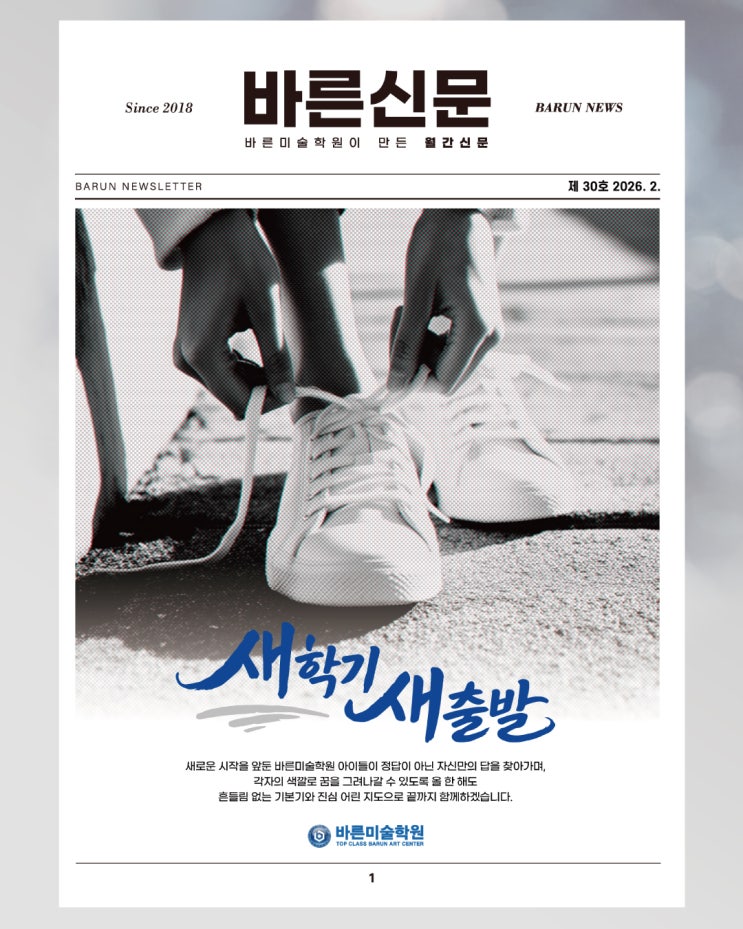 안녕하세요! 바른미술학원 바른이입니다. 바른미술학원 2월의 이야기를 담은 월간신문 〈바른신문〉은 아이들이 준비해온 시간과 그 과정 속 성장의 순간들을 기록했습니다. 새학기는 언제나 설렘과 긴장이 함께 찾아옵니다. 새로운 환경, 새로운 목표, 그리고 다시 다짐해보는 마음가짐까지 예고를 준비하는 친구들에게 유익한 동·서양 미술사 특강부터 전시를 통해 마주한 예술의 흐름, 그리고 하나하나 쌓아 올린 결과까지. 이번 호에는 마무리를 하는 시간 ‘잘 준비하는 시간’의 의미를 담았습니다. 결과는 하루아침에 만들어지지 않습니다. 기본기를 반복하고, 스스로 생각하며, 자신만의 시선을 키워가는 과정 속에서 아이들은 조금씩 단....... <img src="https://blogthumb.pstatic.net/MjAyNjAyMDVfMTgz/MDAxNzcwMjg1MzA4MDU2.Yzc6OMVjzTm1ilYOnp3cAhDqbERqart2sxATBzsoC3cg.NE3PE9ctXDp8qmE_6CrB85fOj6cZRz_6Pjp7Cp_WJEgg.JPEG/KakaoTalk_20260204_123808872.jpg?type=s3" />