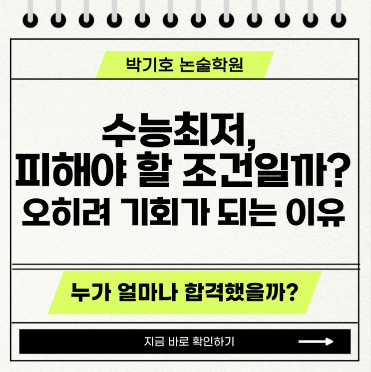 안녕하세요 입시 정보를 정리하며 수험생과 학부모가 헷갈리기 쉬운 포인트를 하나씩 풀어드리고 있는 박기호논술학원입니다 수능최저는 흔히 수능 난도 불확실성 N수생 증가 탐구 과목 선택 변화 같은 이유로 피해야 할 조건처럼 인식되곤 합니다. 하지만 실제 전형 구조를 들여다보면, 수능최저는 오히려 경쟁자를 걸러주는 장치로 작동하는 경우가 많습니다. 수능최저 전형이 오히려 유리해질 수 있는 이유 수능최저를 적용하는 전형의 가장 큰 특징은 다음과 같습니다. 지원 단계에서는 경쟁률이 매우 높아 보이지만 실제로는 수능최저 미충족자와 결시자가 대거 발생 결과적으로 실질 경쟁률이 크게 낮아지는 구조 특히 논술전형의 경....... <img src="https://blogthumb.pstatic.net/MjAyNjAyMDlfMTc5/MDAxNzcwNjMwMTY2Nzk0.JFgHl4AB_bqNIrkjm7EbCF74Fjg0EMhdzGj4mLqz0rMg.2-P_1DgbUdvWFQPrQmdIk0CeDrVVpOsbC9N9FvRGuBUg.PNG/%BD%BA%C5%A9%B8%B0%BC%A6_2026-02-09_%BF%C0%C8%C4_6.42.41.png?type=s3" />