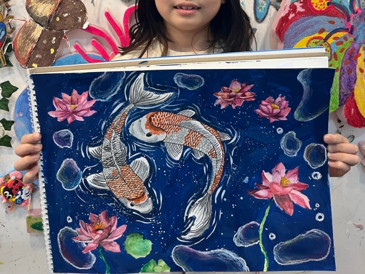 안녕하세요! 그림나무창의미술학원입니다:) 오늘 소개할 수업은 바로바로 연꽃과 연잎이 가득한 연못 속 잉어 그리기예요~~ 잉어는 예로부터 복과 재물, 끈기와 도약, 행운을 상징하는 존재로 집에 걸어두면 좋은 기운을 불러온다고 전해지고 있답니다~! 그럼 우리 친구들은 잉어를 어떻게 표현했는지 구경하러 가보실까요~~?? 잉어의 사진을 보면서 몸의 형태, 꼬리의 방향, 물속에서의 움직임을 관찰해 보고 자유로운 곡선으로 표현해요~~! 위에서 내려다보는 시점으로 연못 속 풍경도 그려줍니당~~ 돌, 연잎, 연꽃, 개구리와 올챙이 등을 자유롭게 배치하면서 스토리와 공간감을 나타낼 수 있어요!! 배경에 입체를 더해주는 클....... <img src="https://blogthumb.pstatic.net/MjAyNjAzMjJfMjcg/MDAxNzc0MTgyOTkwOTky.cM2S09RQ3GupcFvkjPczts15GqjiyJkHDUtX42NgLTog.k2xmM_bRkL6_fTmXEdf51me7L7qWx_LiuNa7pc1a9EMg.JPEG/24D29596-1A34-47AD-B14B-A754C1F24271.JPG?type=s3" />