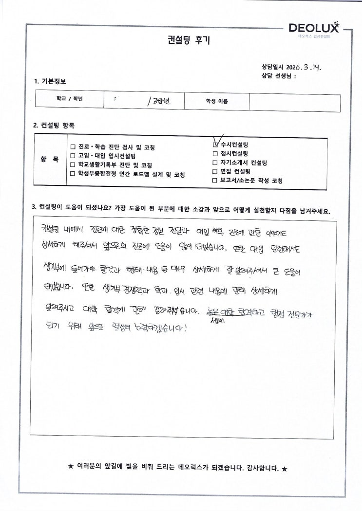 입학사정관 & EBS 진학상담위원 출신 학생부종합전형 컨설팅 전문 대치동 데오럭스 입시컨설팅입니다. ★ 대치동 데오럭스 입시컨설팅 ★ 안녕하세요 대치동 데오럭스 입시컨설팅입니다. 컨설팅 면담을 받는 것이 무조건적으로 좋을까요? 정답은 아니오 입니다. 구체적으로 말하자면, 올바르지 않은 길을 옳다고 주장하는 컨설팅 면담은 오히려 독이 될 수 있습니다. 이를 방지 하기 위한 방법은 여러 곳을 방문하여 종합적인 의견을 도출하는 것이지만, 가장 좋은 방법은 면담을 통해 확실히 도움이 된다고 느낀 곳에서 집중 상담을 진행하는 것입니다. 데오럭스는 그러한 곳이 되기 위하여 끊임없이 노력하고 있습니다. 오늘은 수시 전형을....... <img src="https://blogthumb.pstatic.net/MjAyNjAzMjRfMTk2/MDAxNzc0MzM3MjkxNTAy.x3qyyhKO855KE8nvHL_Bz8s43ZimtPiMlHw8B9yGHnMg.pAiHHTtnSozOlsY-DHFaXn_uqF8qnP-nLDhYtI8ei3wg.JPEG/20260324_%C8%C4%B1%E24.jpg?type=s3" />