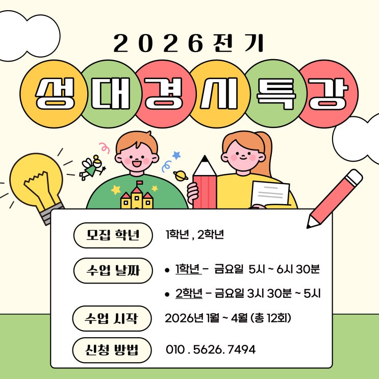 [김해율하사고력수학]율하 2026년 전기 성대경시 대비반 안녕하세요~ 상위권 아이들의 문제해결력과 사고력을 확실하게 끌어올리는 1~2학년 전용 대비반을 모집합니다. 1. 기출 기반의 대표 유형 분석 2. 실전 난이도 문제 적용 3. 시험 직전 점프업 훈련까지 체계적인 단계별 수업으로 아이의 '대회 감각'을 완성합니다. 2026년 전기 성대 경시 안내 ▶시험일 : 2026년 4월 5일 일요일 ▶접수기간 : 2026년 1월 19일 ~ 2월 8일 ▶응시료 : 70000원 2026년 전기 성대 경시 특강반 안내 ▶교재 ▶경시대비 시험은 과제량이 많음 ▶전기 기출 10회 완성을 목표로 반복 출제되는 개념을 정리 ▶정원 6명 선착순 ▶개별 테스트 있음 성대 경....... <img src="https://blogthumb.pstatic.net/MjAyNTEyMjNfOTMg/MDAxNzY2NDY4Njc4NDYy.O8hU29xAN2fmaeGqCrckD7W2Ko8g2PVwRJBk1vWGEKcg.d_IRPJSFk5BPtFwziOH1tjJpaEGkJXGjjZCiEl6O2zYg.JPEG/1.jpg?type=s3" />