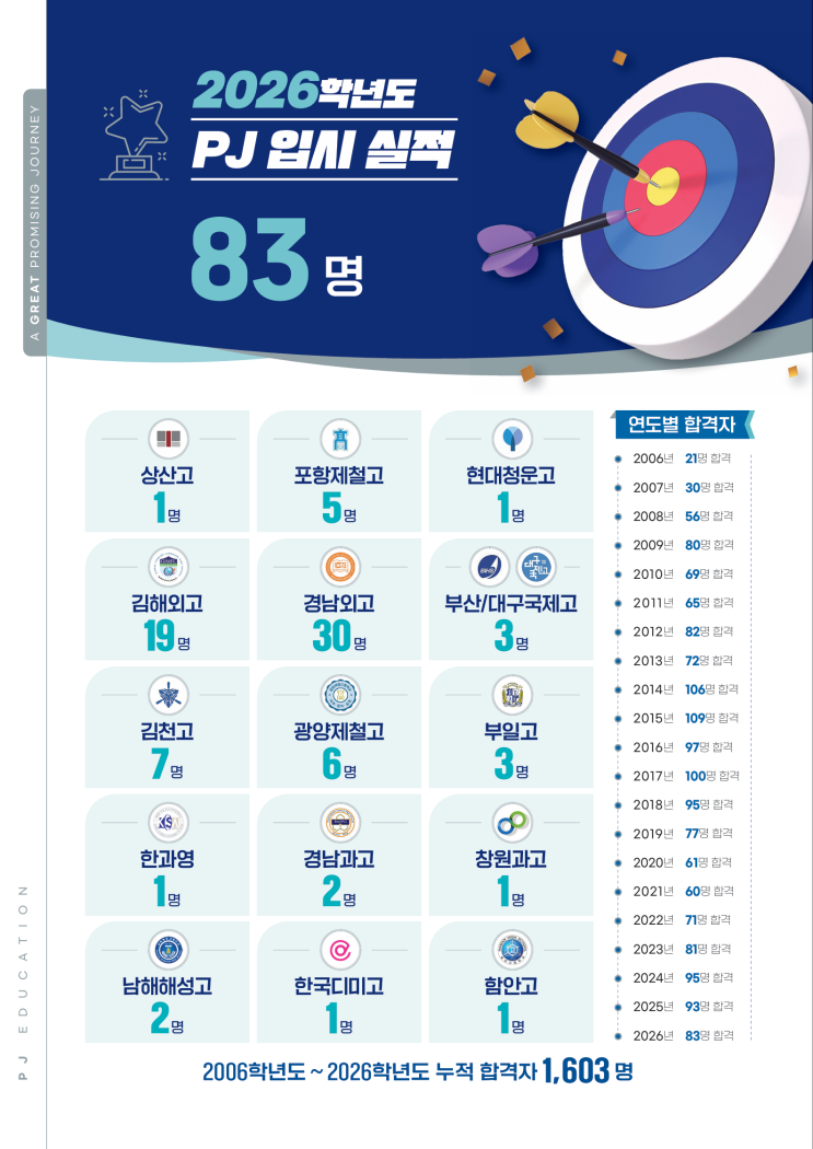 저희 원은 '공부엔 왕도가 없다'를 최고의 가치로 여겨 원생들이 꾸준하고 용맹스럽게 공부할 수 있도록 지도하고 있으며 개원 이후 20여 년간 지역 최고의 특목 합격을, 고등(고급) 영어의 강자들을 배출하였습니다. 2026학년도 합격자는 이례적으로 장기 재원생 출신이 많았고, 매해 특목 자사고 진학 후에도 학교 내 영어 고득점 및 우수자는 박정에서 꾸준히 공부한 친구들이 많다는 이야기와 귀결됩니다. 이는 분위기에 좌우 않는 한결같은 믿음, 철저한 학습관리와 독자적인 교수법이 있어 가능합니다. 앞으로도 한국 대표 인재 양성의 산실을 지켜나갈 것입니다. * PJ박정 베리타스 수업의 특혜 ! 학교 공식 설명회에서는 들을....... <img src="https://blogthumb.pstatic.net/MjAyNjAxMTJfNjIg/MDAxNzY4MjAyOTk2NzE1.a21znAQFY0l7cBacVG7ijTcrPTL_dswBGFi3nxtuLpsg.F7pcnvOvo7K4w0ypMvbk2UK7TS5HdTKwVd7ODAA0IuYg.PNG/20260112_162951.png?type=s3" />