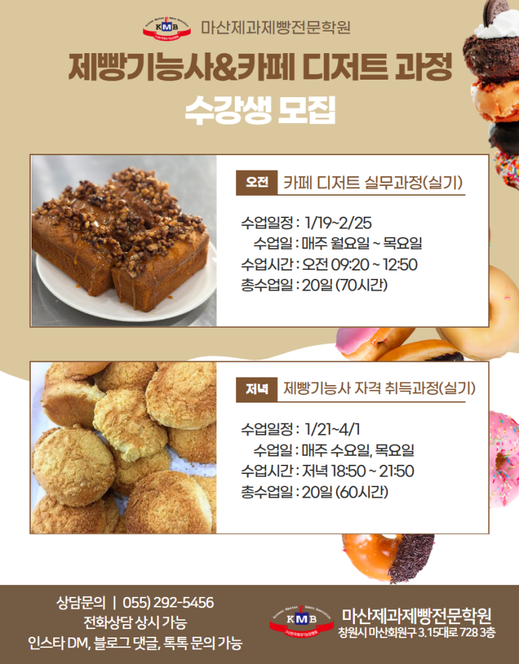 대상 : 일반생 및 국비생 중, 고 ,대학생 등 누구나 수강 가능 < 수업소개 > ▶ 카페 디저트(실기) 수업 내용 : 일반적인 베이커리 카페에서 판매되는 다양한 디저트류 메뉴를 배울 수 있는 과정입니다. ▶ 제빵기능사(이론+실기) 수업내용 : 제빵기능사 자격증 취득을 위한 이론수업과, 실기수업을 병행합니다. ⭐ 과정 수강신청 · 고용24 ↓ (검색창에 마산제과제빵전문학원 검색 후 수강신청) ⭐ 마산제과제빵전문학원 문의 안내 문의 채널 네이버 톡톡 : 배너 클릭 시 연결 인스타그램 : @masanbread 전화 문의 : 055-292-5456 상담 가능 시간 : 오전 9시 ~ 오후 6시 상담 시간 외에는 원활한 상담이 어려울 수 있습니다 주....... <img src="https://blogthumb.pstatic.net/MjAyNjAxMDdfOTEg/MDAxNzY3NzY5MDk5Mzkw.3RgXLH8WaZ1S8V8zm7PyP_tvU0EJxl7uQ8dlM74Q3jgg.vUEignjiw69WTck4FNir_4HSTPD5EPReJ7YJjOn6zhQg.PNG/%B3%D7%C0%CC%B9%F6%C5%E5%C5%E5%C3%A2%BF%F8%C1%A6%B0%FA%C1%A6%BB%A7%2C%B8%B6%BB%EA%C1%A6%B0%FA%C1%A6%BB%A7%C0%FC%B9%AE%C7%D0%BF%F8%2C%B8%B6%BB%EA%C1%A6%B0%FA%C1%A6%BB%A7%C7%D0%BF%F8%2C%B1%B9%BA%F1%C1%A6%B0%FA%C1%A6%BB%A7%2C%B8%B6%BB%EA%BF%F8%B5%A5%C0%CC%2C%C3%A2%BF%F8%BF%F8%B5%A5%C0%CC%2C%C3%A2%BF%F8%BA%A3%C0%CC%C5%B7%2C%B8%B6%BB%EA%BA%A3%C0%CC%C5%B7%2C%B1%E8%C7%D8%C1%A6%B0%FA%C1%A6%BB%A7%C7%D0%BF%F8%2C%B1%E8%C7%D8%C1%A6%B0%FA.png?type=s3" />