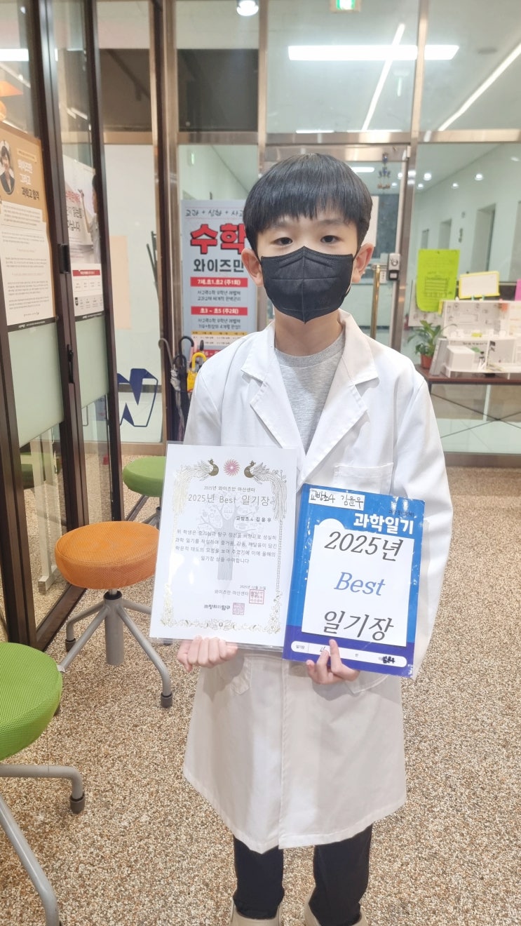 안녕하세요 마산 와이즈만 입니다 12월 우수일기와 올해의 베스트 일기장 상 포스팅입니다 <교방초5 김0우> 마산 와이즈만 2025년 올해의 일기장 상을 수상합니다 다양한 형식과 실험설계부터 수업을 통해 깨달은 점 , 보완할 점 , 표현력, 정성스런 글씨로 성실하게 과학일기를 작성하며 즐거움, 감동, 깨달음이 담긴 모범을 보여 주었기에 올해의 일기장 상을 수여합니다 "12월 우수일기" 모두 축하합니다 양덕동 메트로스퀘어 5상가 3층 화,수,목,금 1시30~10시 토 9시~6시 1월 진행되는 과학 수업내용- 체험문의 055-222-6234 #마산영재원 #마산과학학원 #실험과학 #마산실험과학학원 #창원실험과학 #무료진단 #사고력수학 #....... <img src="https://blogthumb.pstatic.net/MjAyNjAxMDlfMzIg/MDAxNzY3OTUxNjU3MDI1.8WLthW-oUwgQzdZbG5DJJXAvHhxxvNQE4ArexhQHuQQg.TIT6-YG0yEYd203bzxzRKtDbPJOsdXQ9A0Oxi1hcBocg.JPEG/KakaoTalk_20260109_175132206_01.jpg?type=s3" />