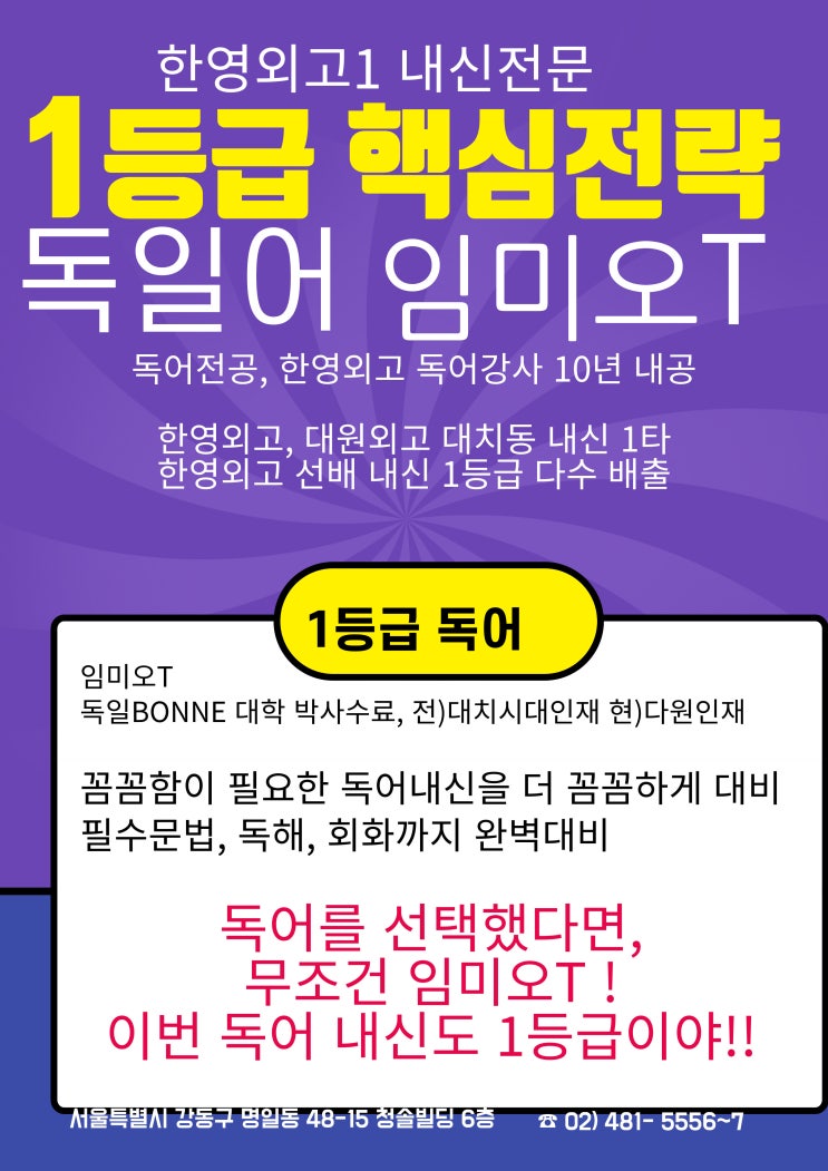 ♥한영고2 임미오T 독일어 중간고사 1등급목표 1회 직보특강 안내 ♥독어 1등급을 위한 단 1회의 기회 쉽지만 빈틈을 완벽히 대비한 자신만만 특강! 25‘ 한영고 수강생 만점 및 1등급 다수배출!! 한영고 선배가 강력 추천하는 특강! ⊙개강일 :4월 28일(화) →금요일 PM 12:00~3:00 (직보시간은 시간표 확정 후 변동 될 수도 있음) ※첫 시험의 내신핵심인 동사변화, 발음, 문법을 확실히 잡는다. -학교 내신교재 프린트 기출 완벽대비 ☆10년내공의 한영외고 독어내신 임미오T (*한영외고 독어샘→한영고) 한영외고 한영고 대원외고등 대치동 내신1타 ★임미오T 이화여대 수석졸 독일BO 박사수료 전)대치 시대인재 ☎사전 예약 부탁드립니다. 교....... <img src="https://blogthumb.pstatic.net/MjAyNjA0MDFfMjg0/MDAxNzc1MDM1MDIzMTgy.FX1D-MFNIhqm72nxV7Aqsyq_nwXLcai8gzMPZf0Rp3Ag.wn6-o1z7B1QuZI8R_4aAIBSZzp_nnWE3MlquvnvK3Sog.JPEG/%BF%A9%B7%AF%BC%B1%BB%FD%B4%D4%C7%C1%B7%CE%C7%CA-051.jpg?type=s3" />