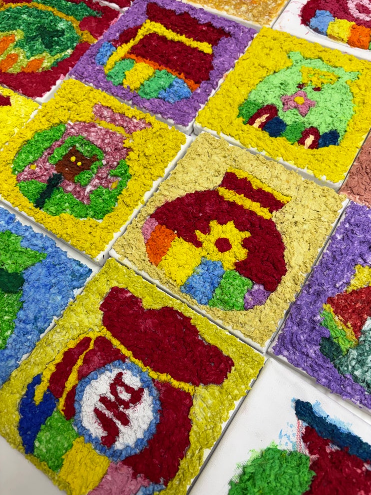 종이죽 만들기 저희 뜰미술학원은 한 두달에 한번 씩 만들기를 해요! 1-2월 만들기는 종이죽 공예에요! 종이죽은 못쓰는 폐지, 휴지 등을 물에 불려서 목공용풀과 물감을 섞어서 만들어요! 2월은 설날이 껴있어서 복주머니를 주제로 그려보았어요 하.. 오방색으로 너무 예쁘지 않나요? 과연 이걸 어떻게 만드는지 궁금하시죠? 캔버스에 스케치 + 색연필 채색후 색을 직접 만들어서 핀셋과 이쑤시개를 이용해서 하나하나씩 수놓듯이 올려줍니다! 굉장한 집중력을 요하는 작업이라 그런지 아이들이 한마디도 안하고 초초초! 집중 하더라구요 다른 친구들 작품도 자랑하자면! 너무 예쁘죠!?? 다같이 놓고 보면 정말 근사하답니다! 물고....... <img src="https://blogthumb.pstatic.net/MjAyNjAyMDJfNDcg/MDAxNzcwMDM5NzE5NDY0.zd1orCbk3i4_vTNA2pxImyqaqSewnFSZV1hV5La9VKMg.hxYRFNjuoqJebI4MPAzZbnFkP2juC4M3gPJMiUJPR18g.JPEG/IMG_9012.jpg?type=s3" />