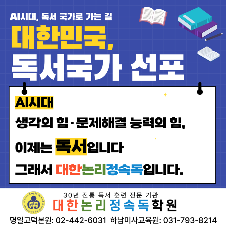AI 시대, 생각의 힘, 문제해결능력의 힘!! 이제 다시 독서입니다!! 그래서, 대한논리정속독입니다!! 인공지능(AI) 시대에 필요한 스스로 생각하는 힘(문해력)을 국가 핵심전략으로 격상하고 독서교육을 국가 교육 패러다임으로 전환하기 위한 ′독서 국가 선포′하다 AI가 우리 대신 읽어줄 수는 있어도, 우리 대신 생각할 수는 없습니다, 국회, ′독서국가′ 선언--- 암기식 교육에서 문해력 중심으로 ″AI 시대 독서는 스스로 생각 ·질문하는 인재 키워내는 교육 대전환 핵심˝ 책과 친숙해지는 영유아 시기에는 ′독서유치원′을 독서습관을 형성해야할 초등학교에서는 ′독서중점 초등학교′를, 다양한 책을 통해 진로 탐색을 해야 할 중학교....... <img src="https://blogthumb.pstatic.net/MjAyNjAyMDdfMjU5/MDAxNzcwNDM2NjEyMjg2.idvNsvPqc9TJhwh3vKVpxhIpHlumD1UoJxeerxyYzbog.P5dO-FOYuWWptwmhx1bWjX3sLDfJcD9_zZ4dljbW23sg.PNG/%B5%B6%BC%AD%B1%B9%B0%A1_%BC%B1%C6%F7%283%29.png?type=s3" />